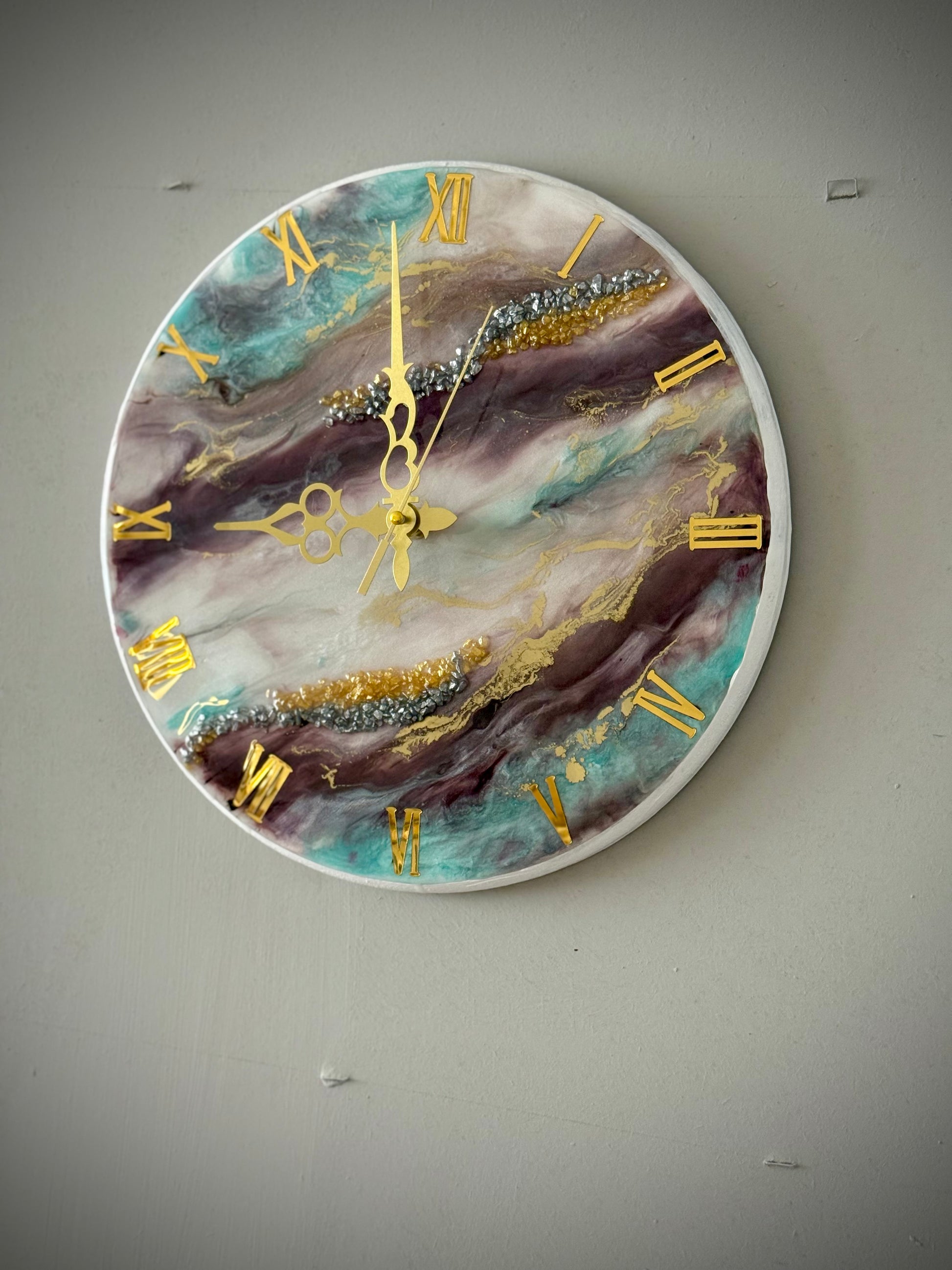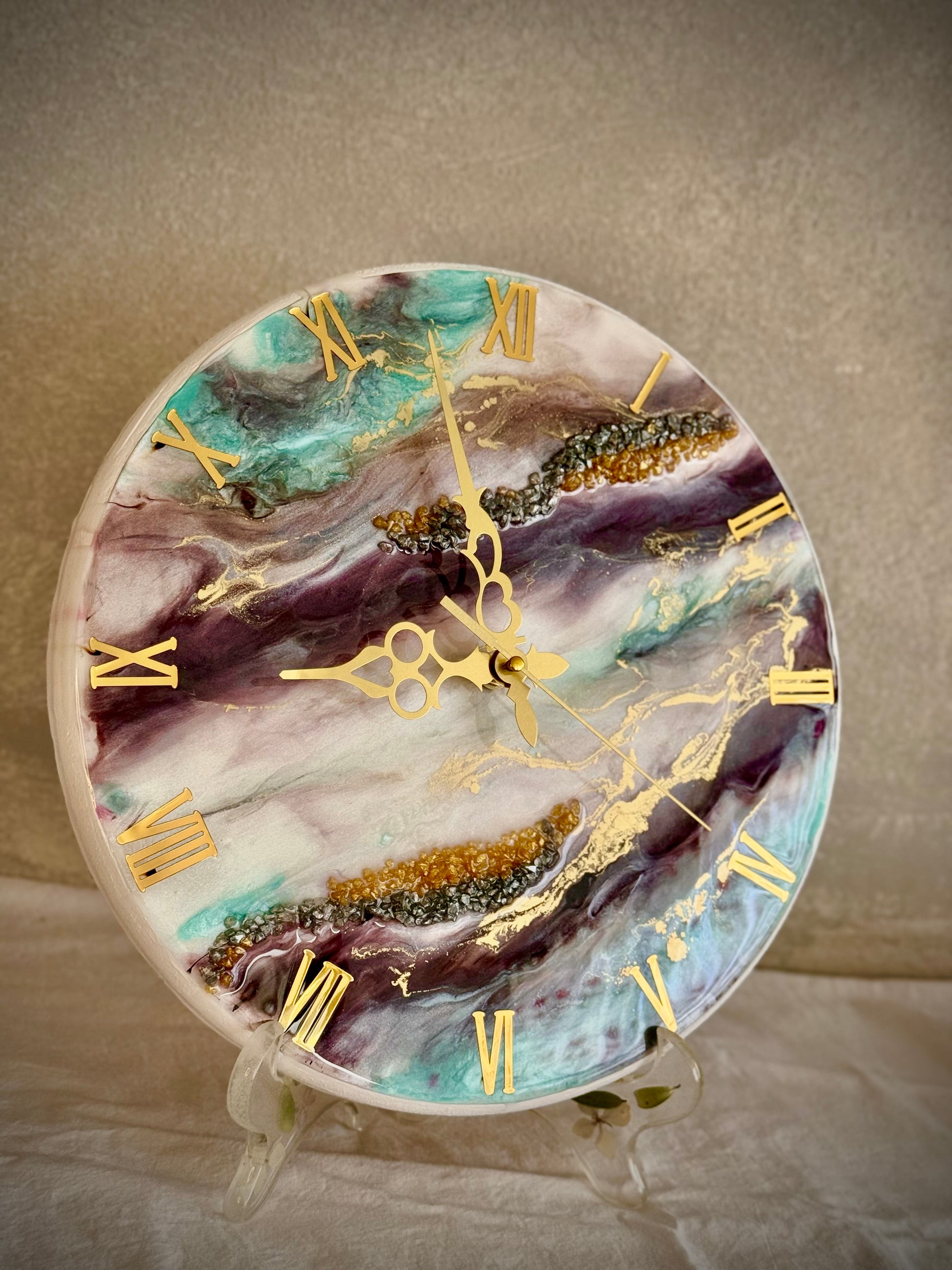 33’e 33 mdf üzerine uyarlanmış yeşille beraber çikolata kahvenin karıştığı cam kırıklarıyla beraber süslenmiş şık epoksi saat