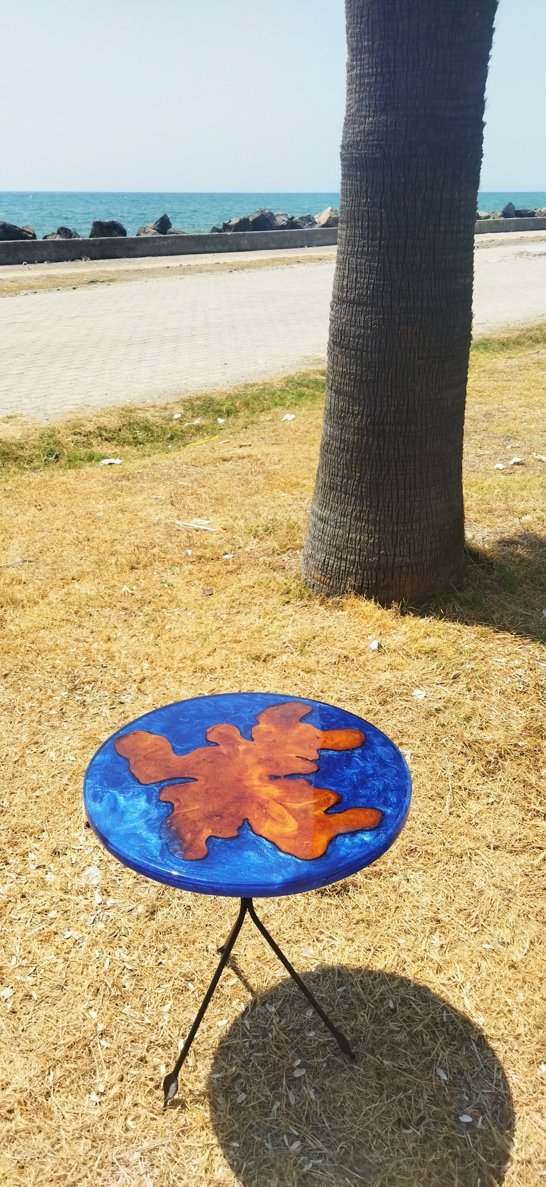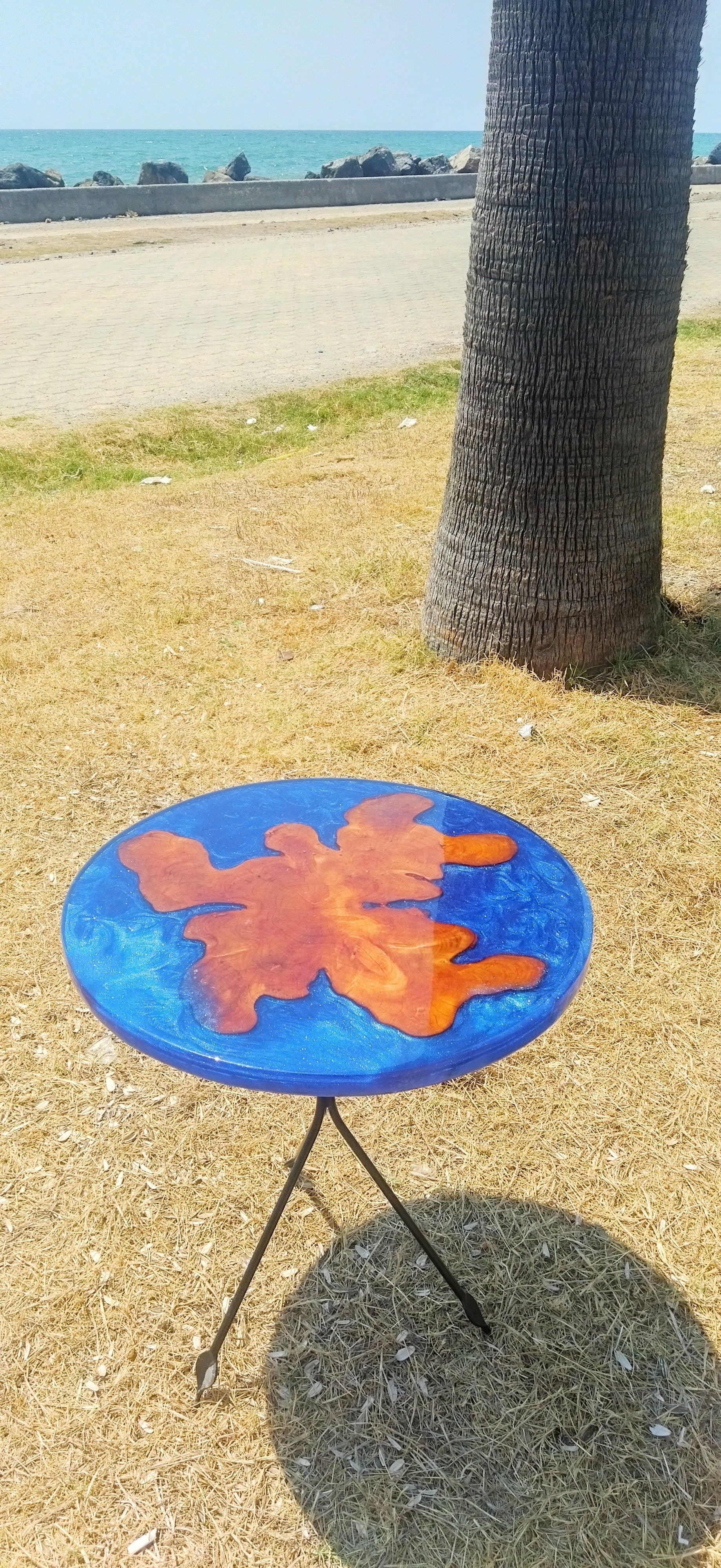50 santim 50 santim ve batımında olup 45 santim demir profiline yapılmış ayakla beraber kombinlenmiş mavi renkte epoksi sehpa
