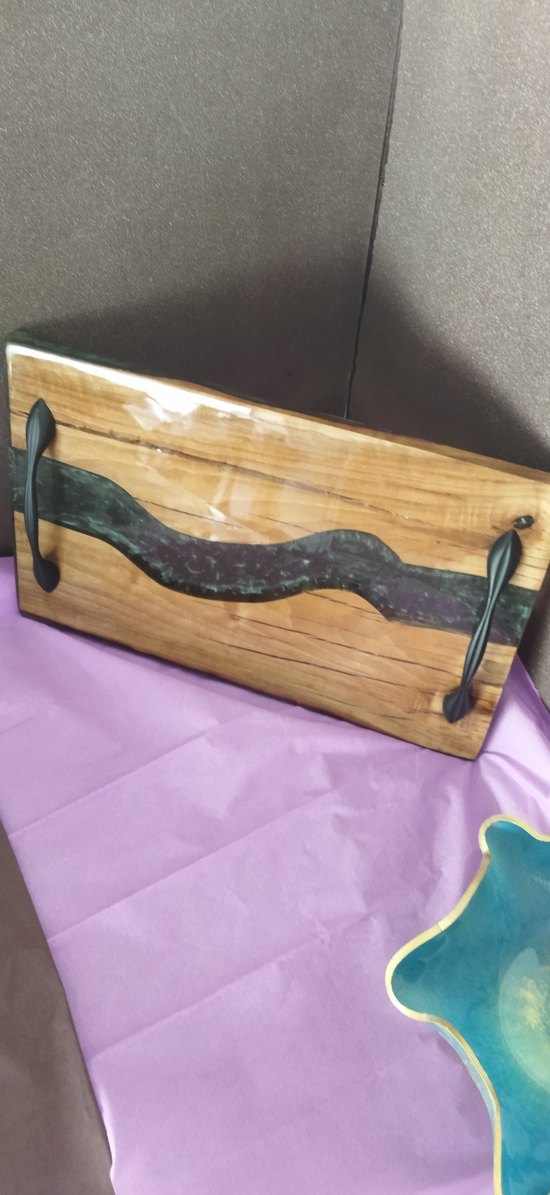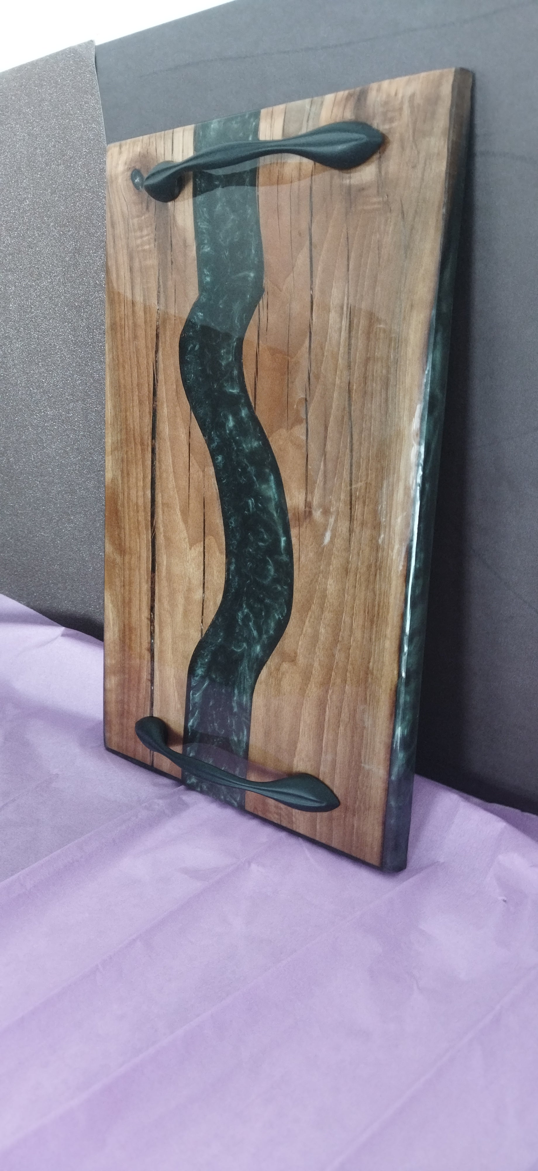 Epoksi ile beraber ceviz ağaçları birleştirilmiş siyah renk kulp takılmış dayanıklı uzun müddet mutfakta kullanabileceğiniz epoksi tepsi