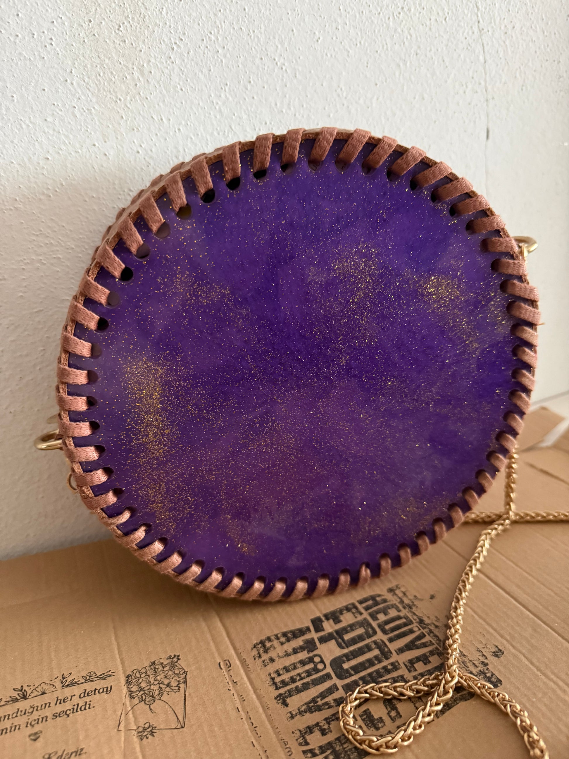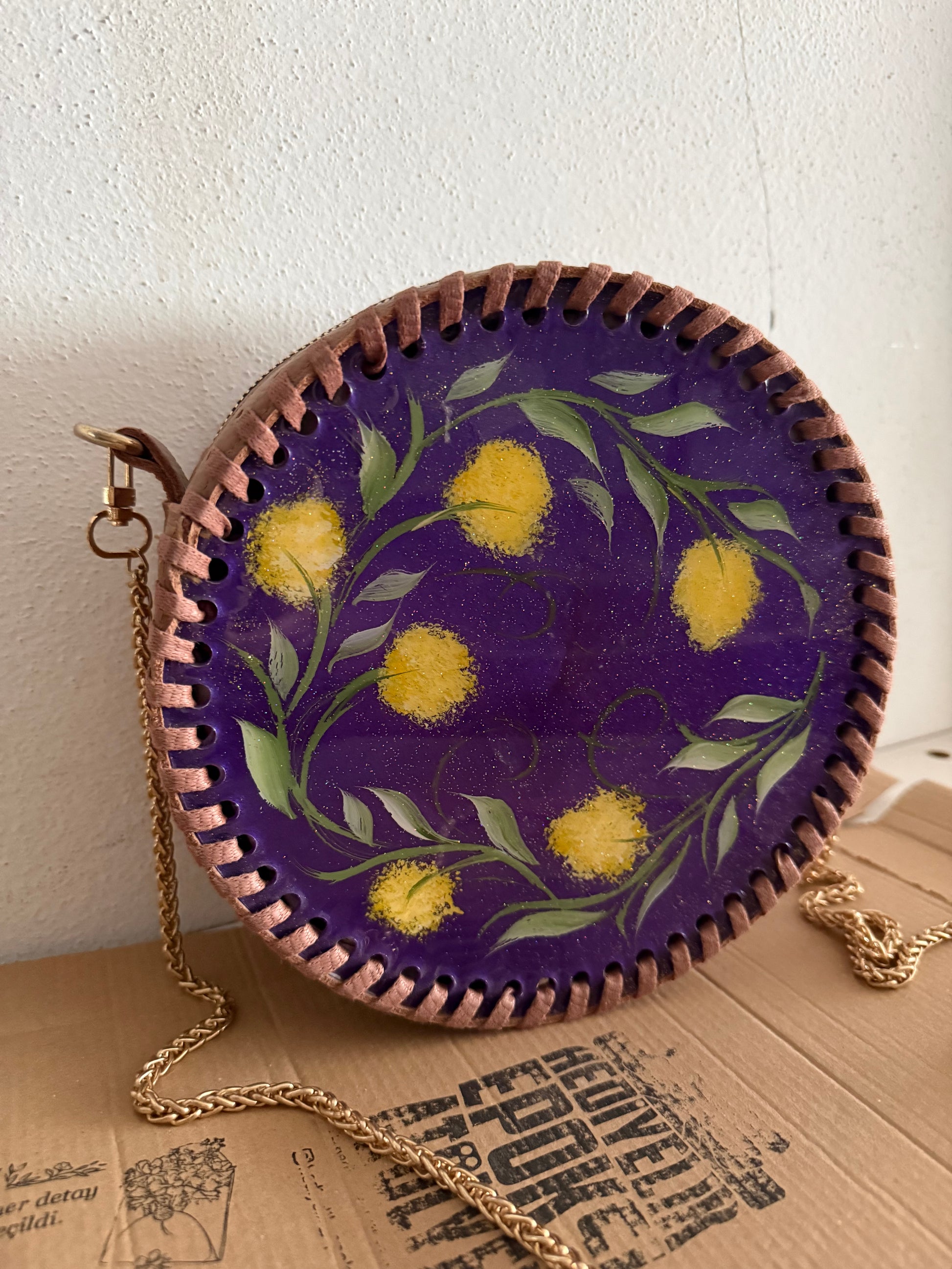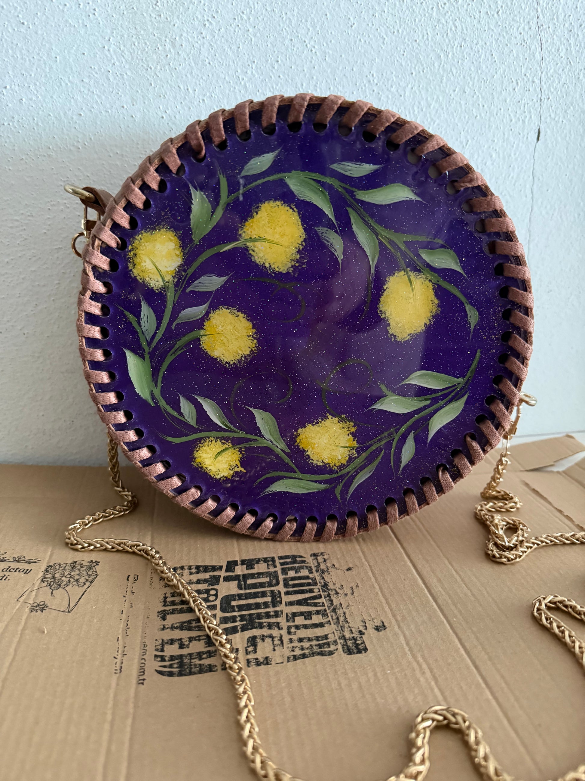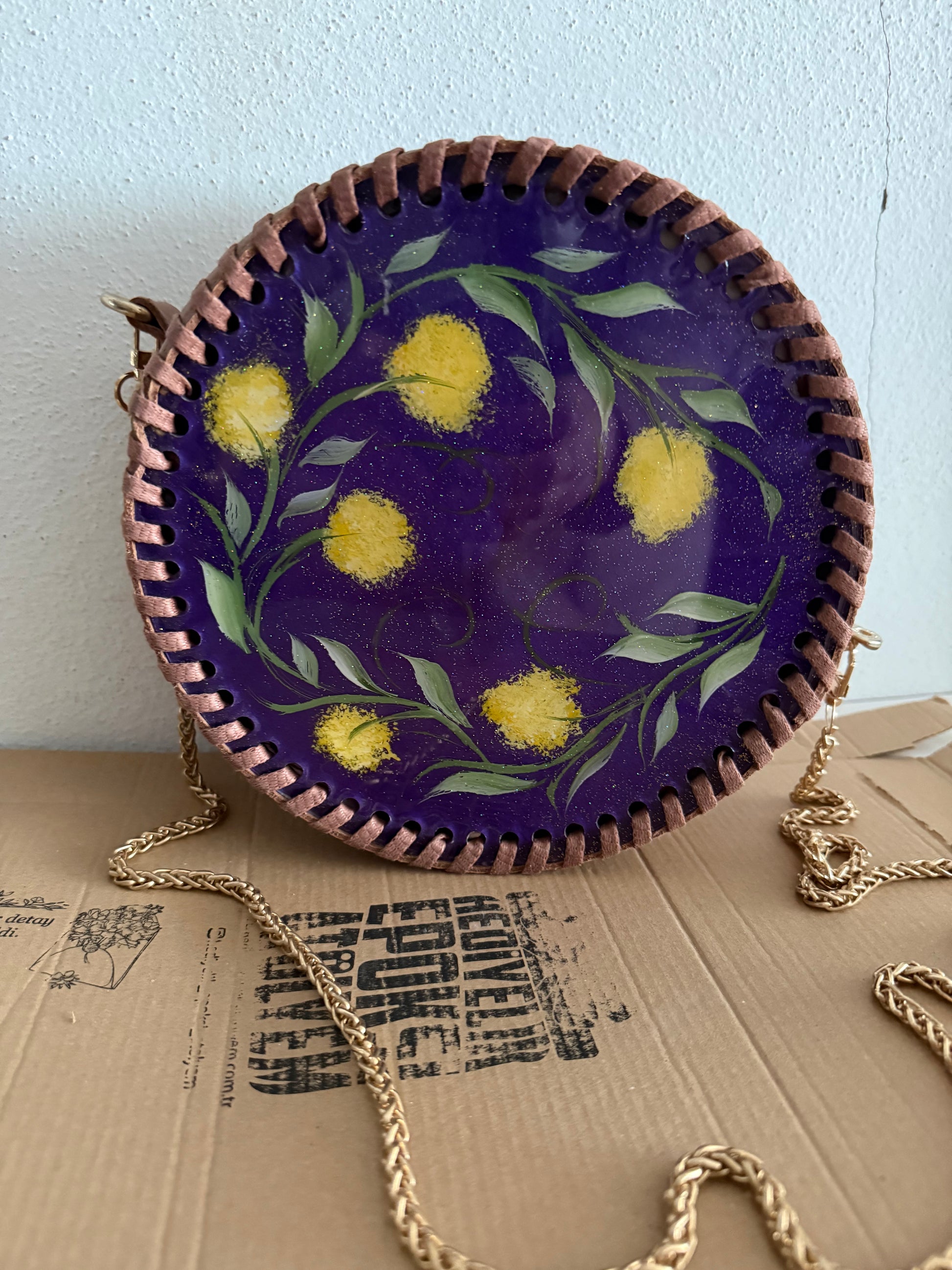Davul Çanta olarak bilinir özel hakiki deri ile tasarlanmış mor renk üzerine sarı çiçekler uygulanmış sadece Foça tekniği ile elde edilmiş epoksi üzerine yapılmış olan özel tasarım çanta bir adettir bu çantadan sadece sizde olacaktır dünyada bir tektir