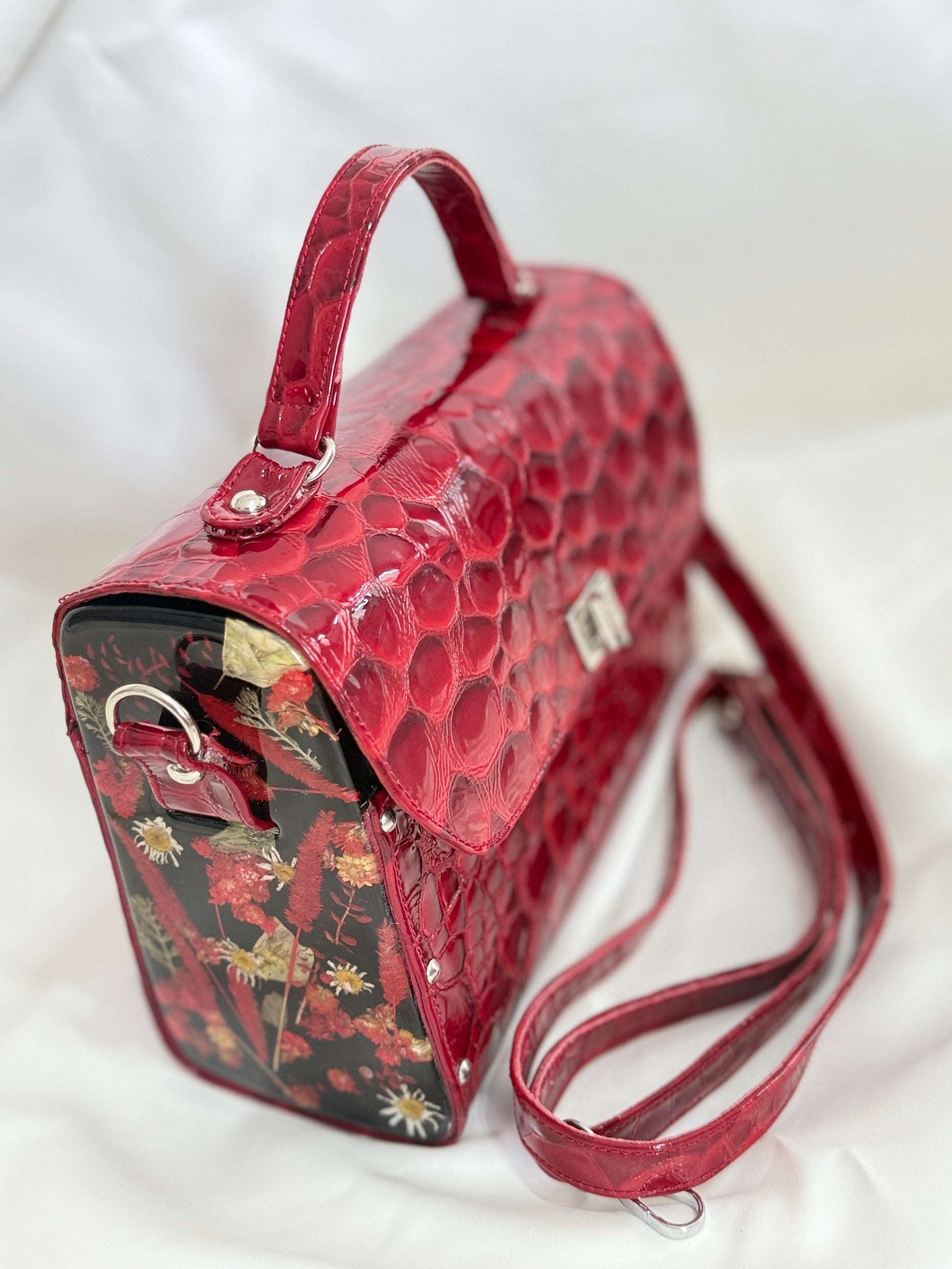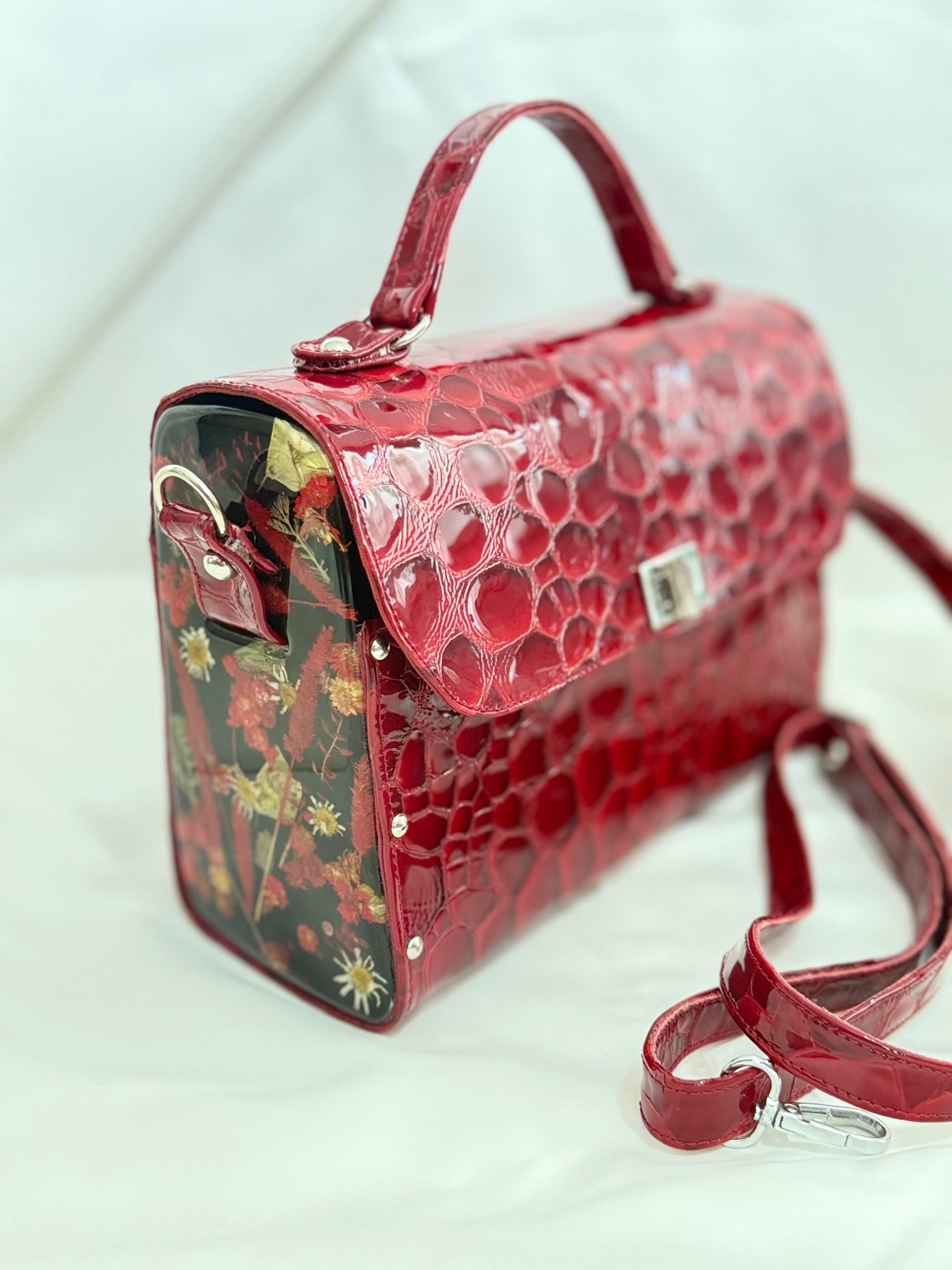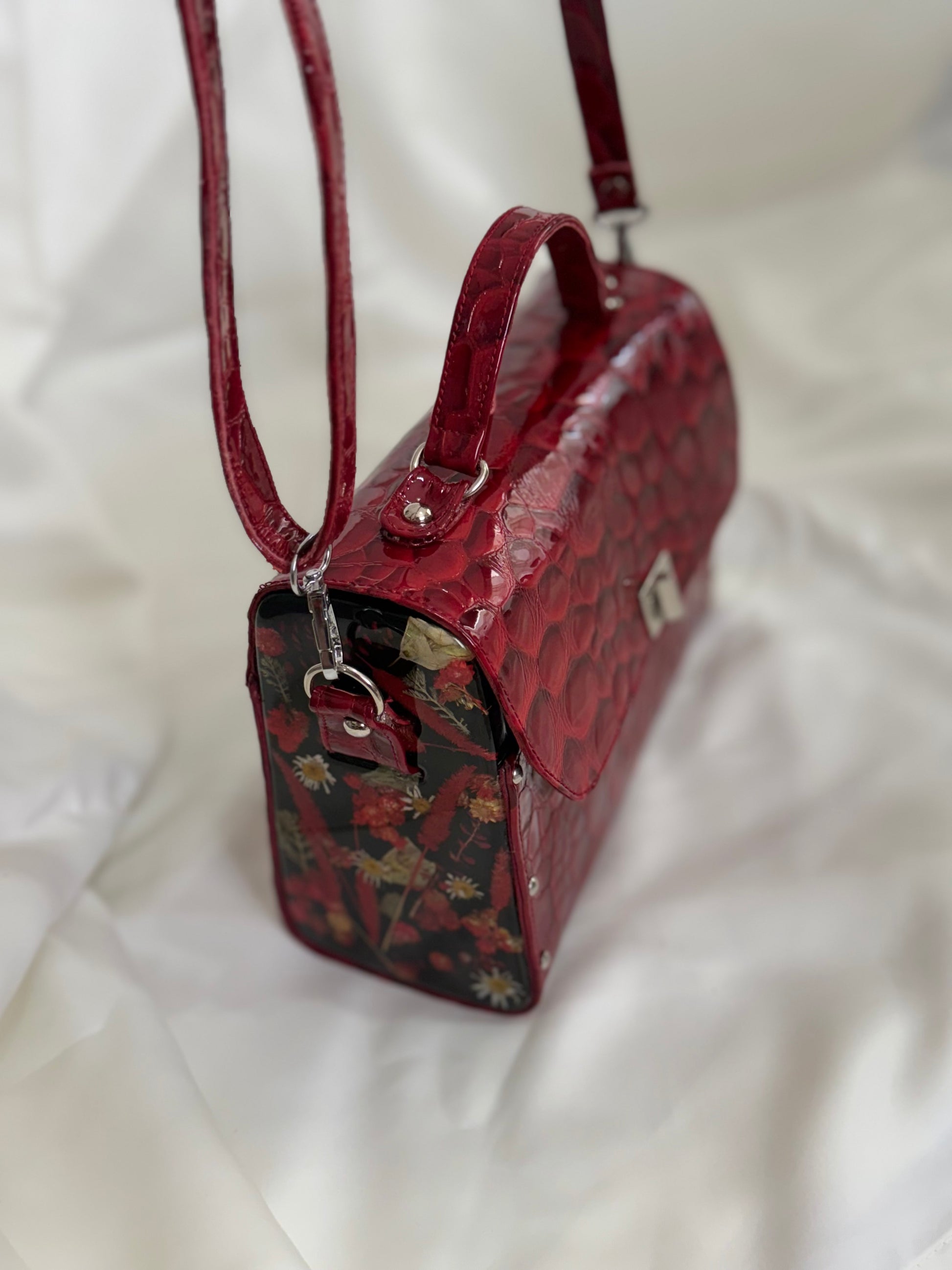 İçinde papatyalar sultan otu özel kurtulmuş çiçeklerle yapılmış epoksi çanta kırmızı hakiki kroki deri ile birleştirilmiş içinde üç tane gözü olup kullanışlı 25 santime 18 santim ebatında olup büyüklük olarak ideal istersen çapraz olarak takma askısı istersen el çantası olarak kullanabilirsin yıllarca sizlere eşlik edecek çanta
