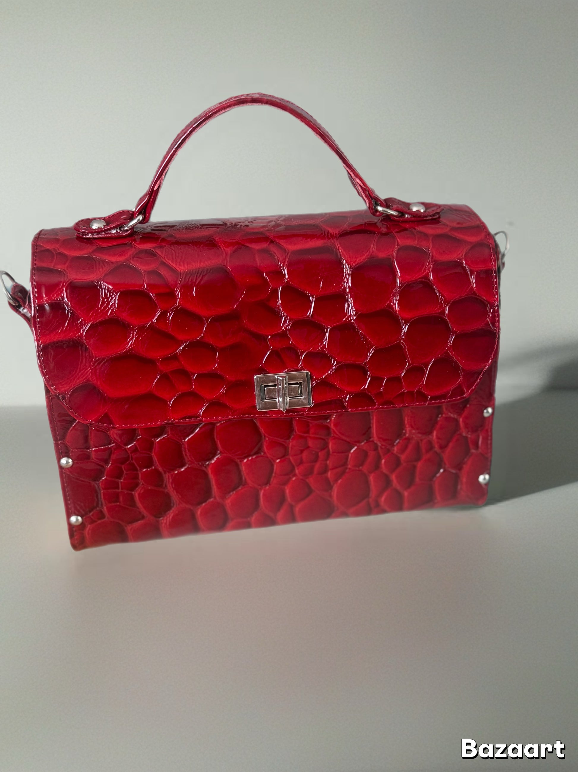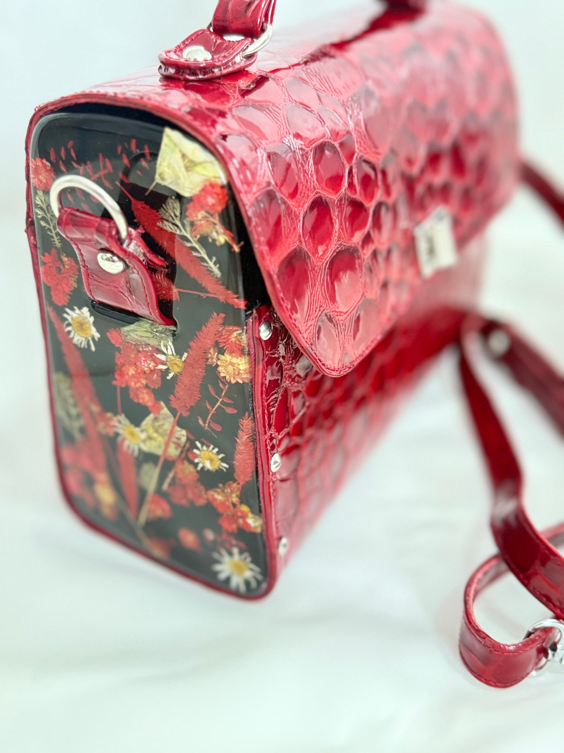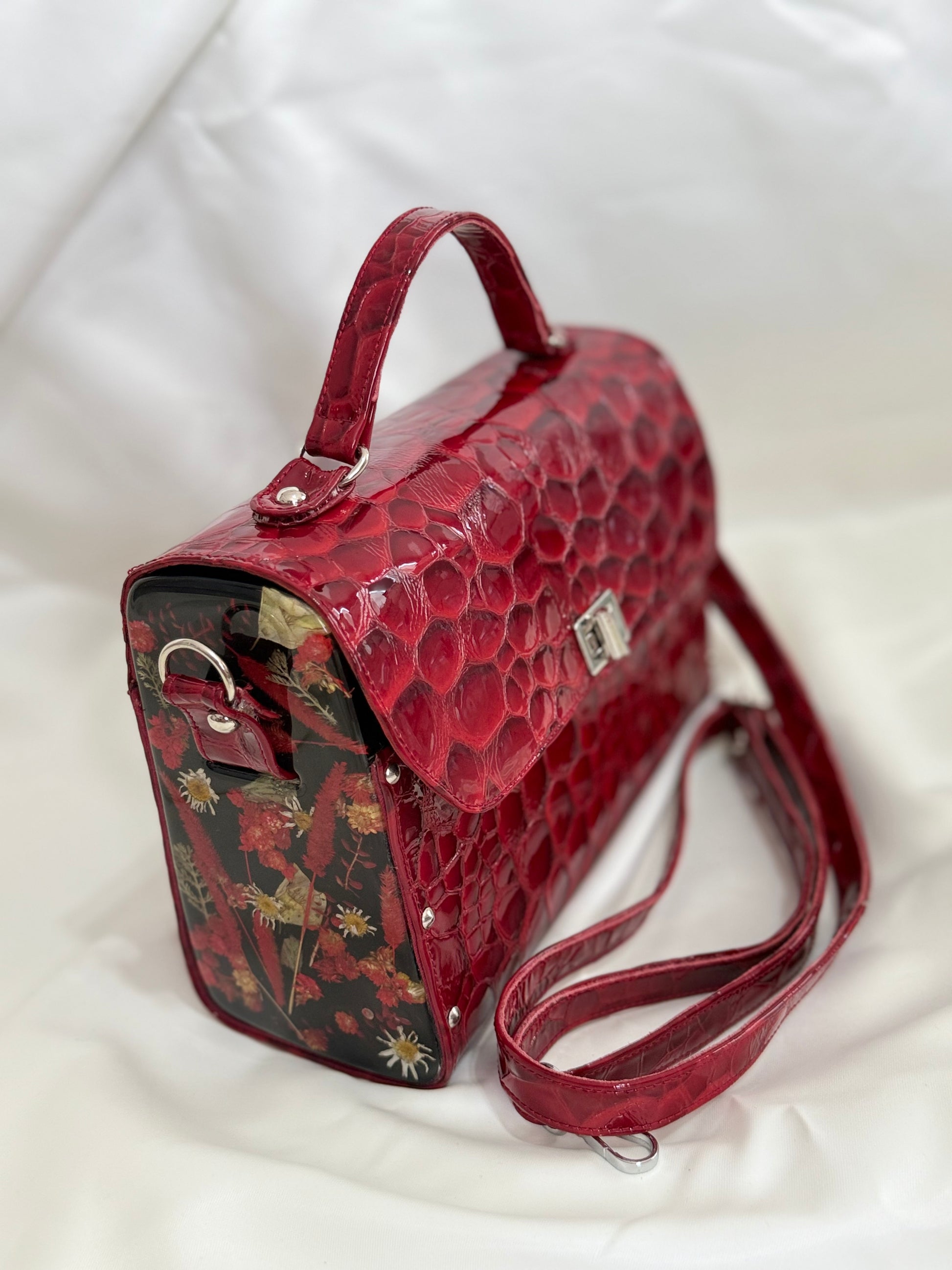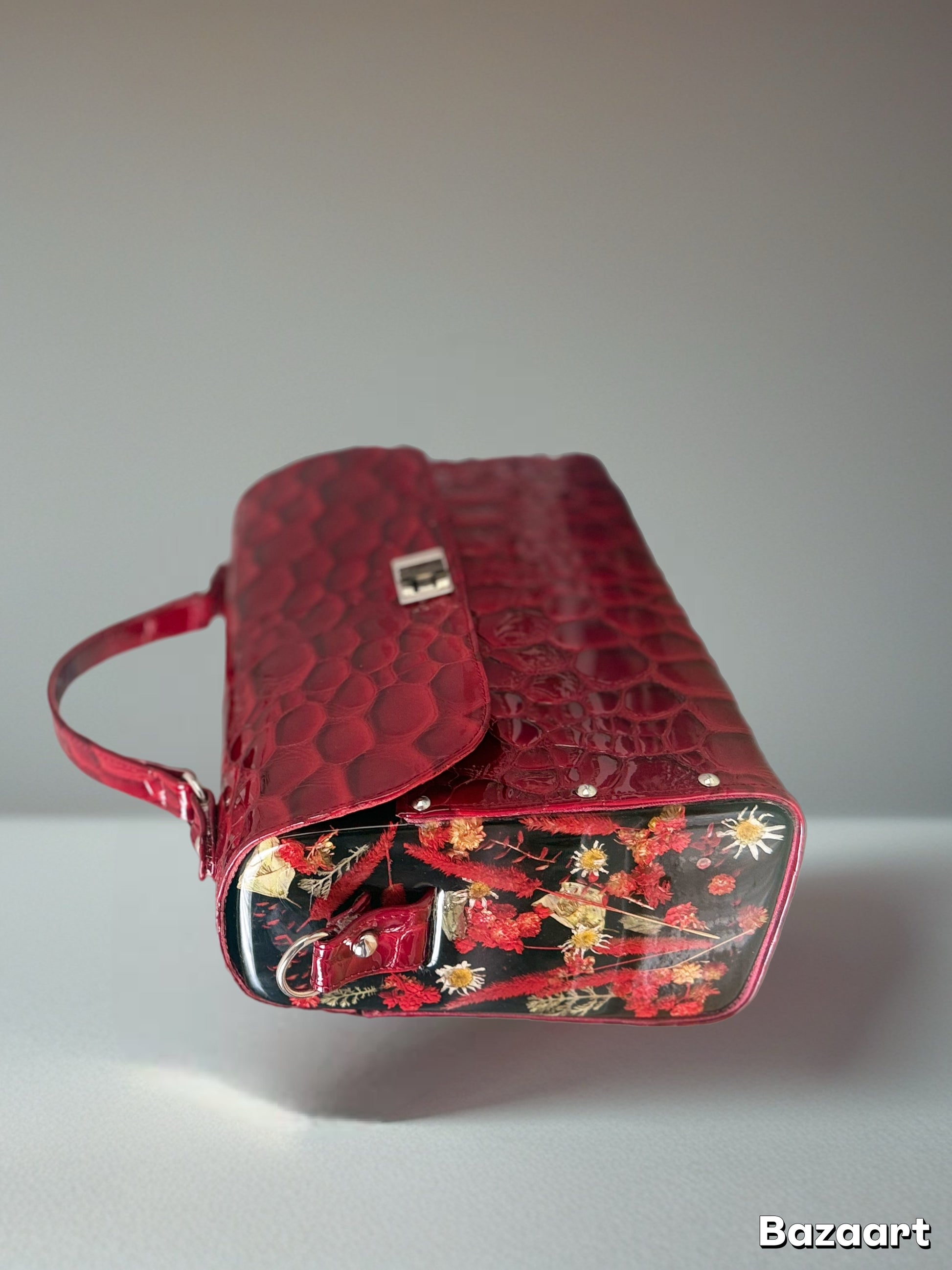 İçinde papatyalar sultan otu özel kurtulmuş çiçeklerle yapılmış epoksi çanta kırmızı hakiki kroki deri ile birleştirilmiş içinde üç tane gözü olup kullanışlı 25 santime 18 santim ebatında olup büyüklük olarak ideal istersen çapraz olarak takma askısı istersen el çantası olarak kullanabilirsin yıllarca sizlere eşlik edecek çanta