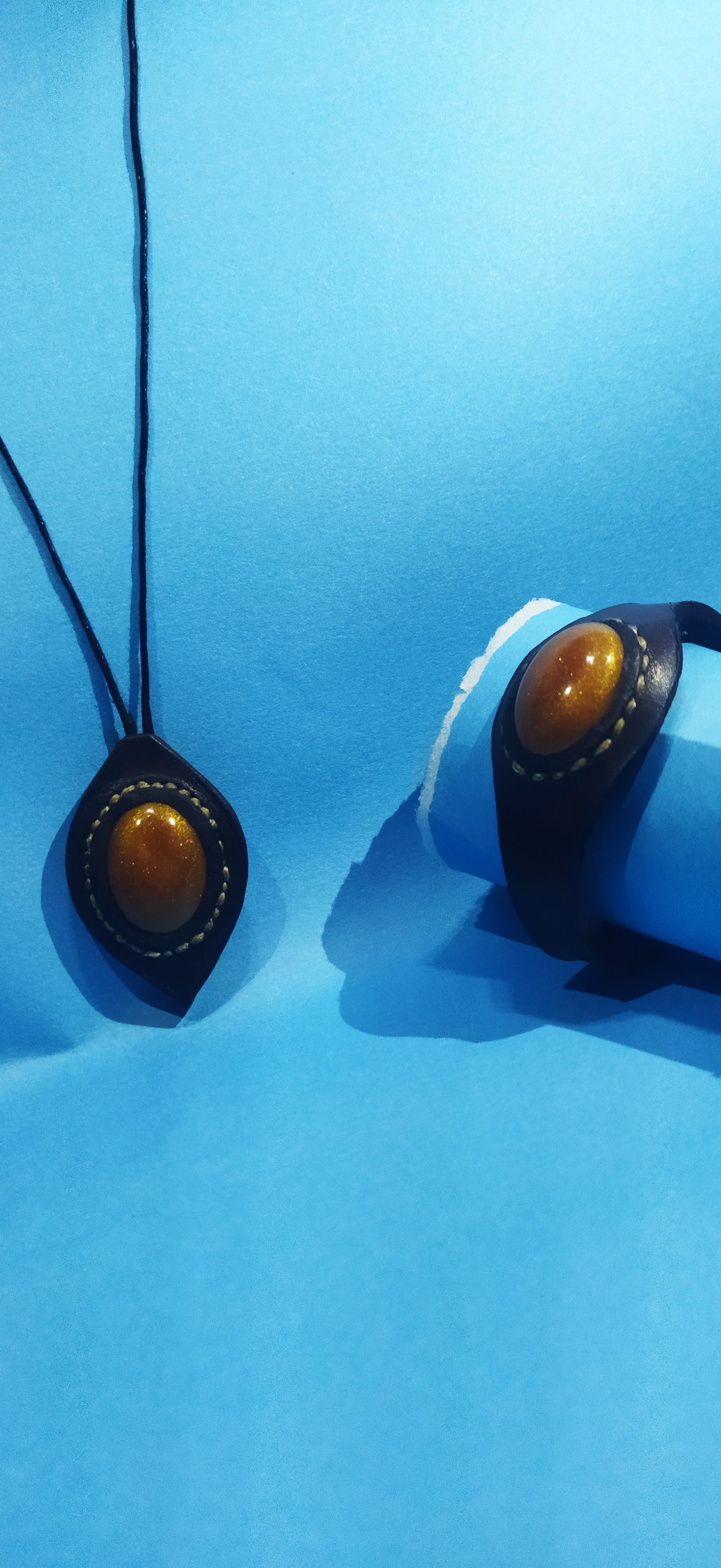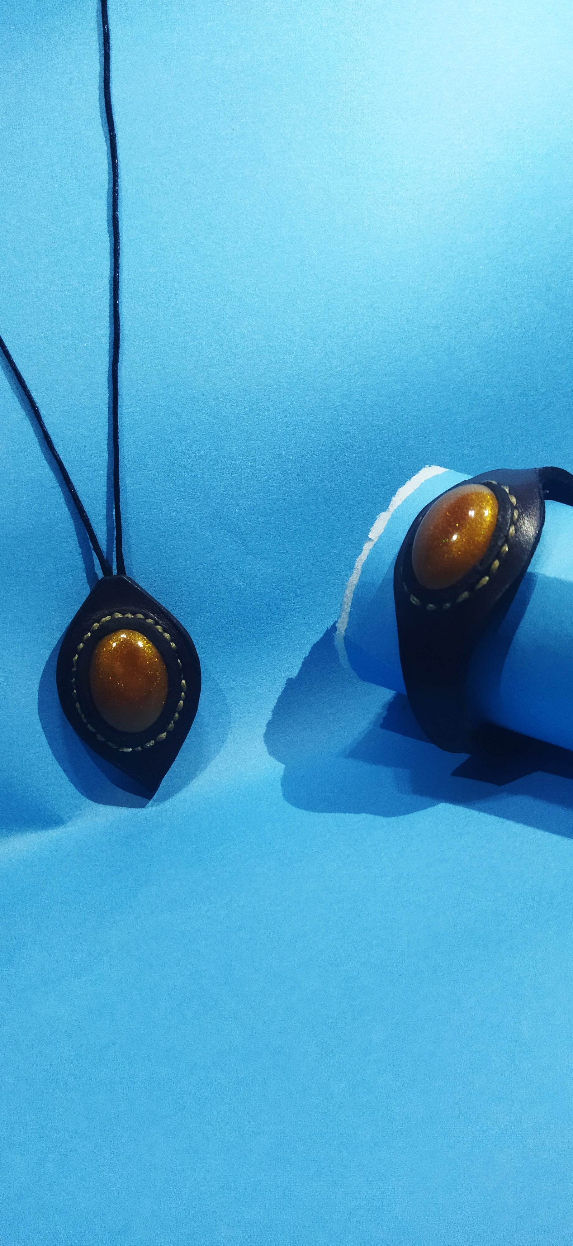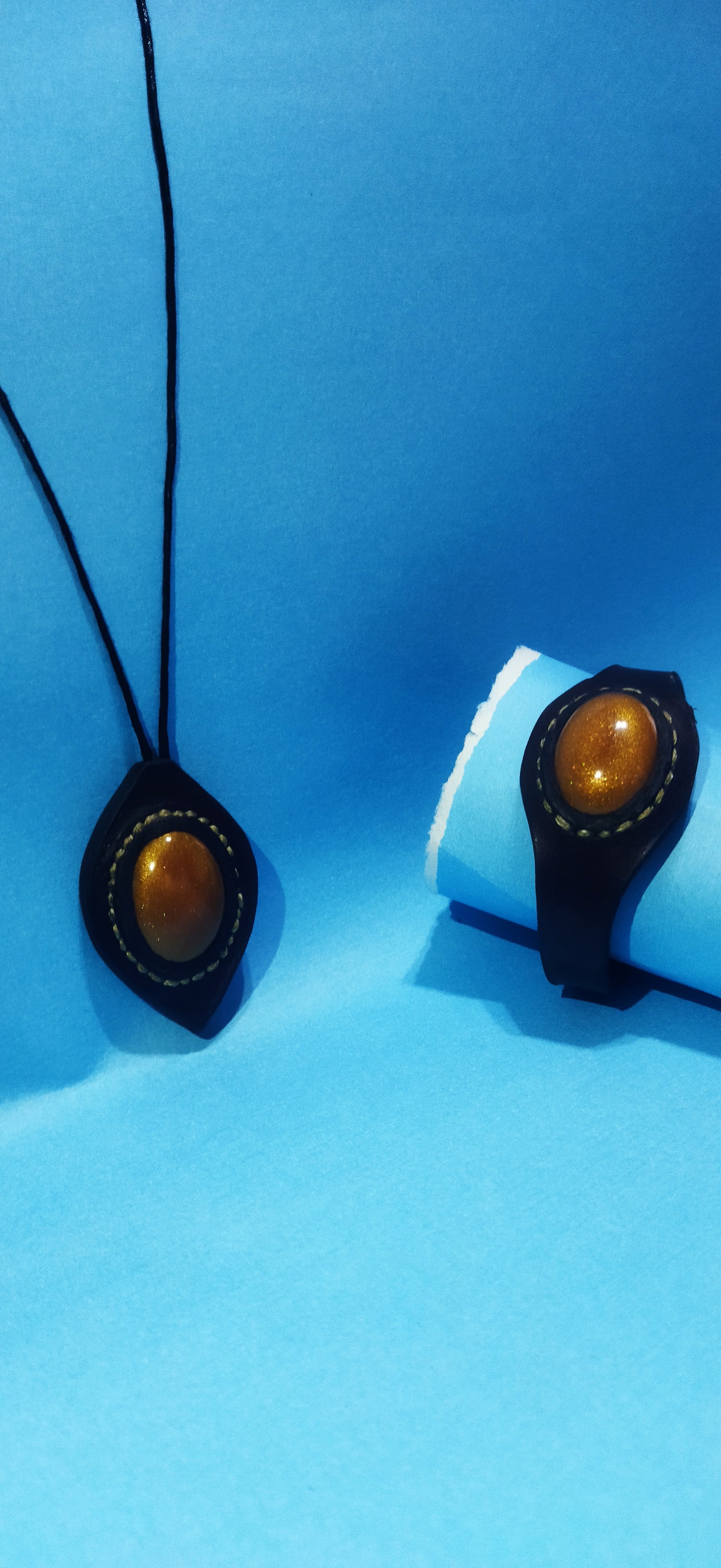 Epoksi ile beraber hakikileri birleştirilmiş kolye ve bileklik yapılmıştır