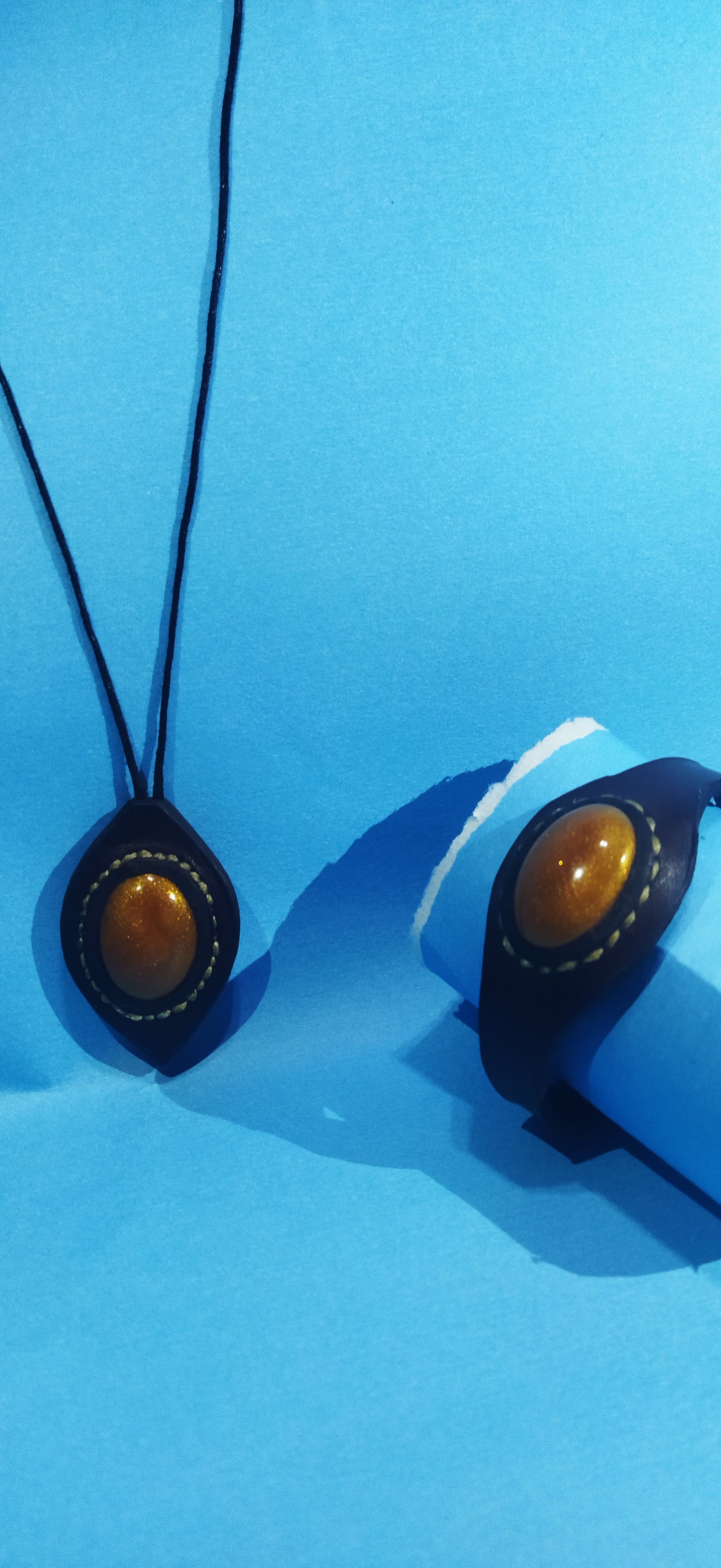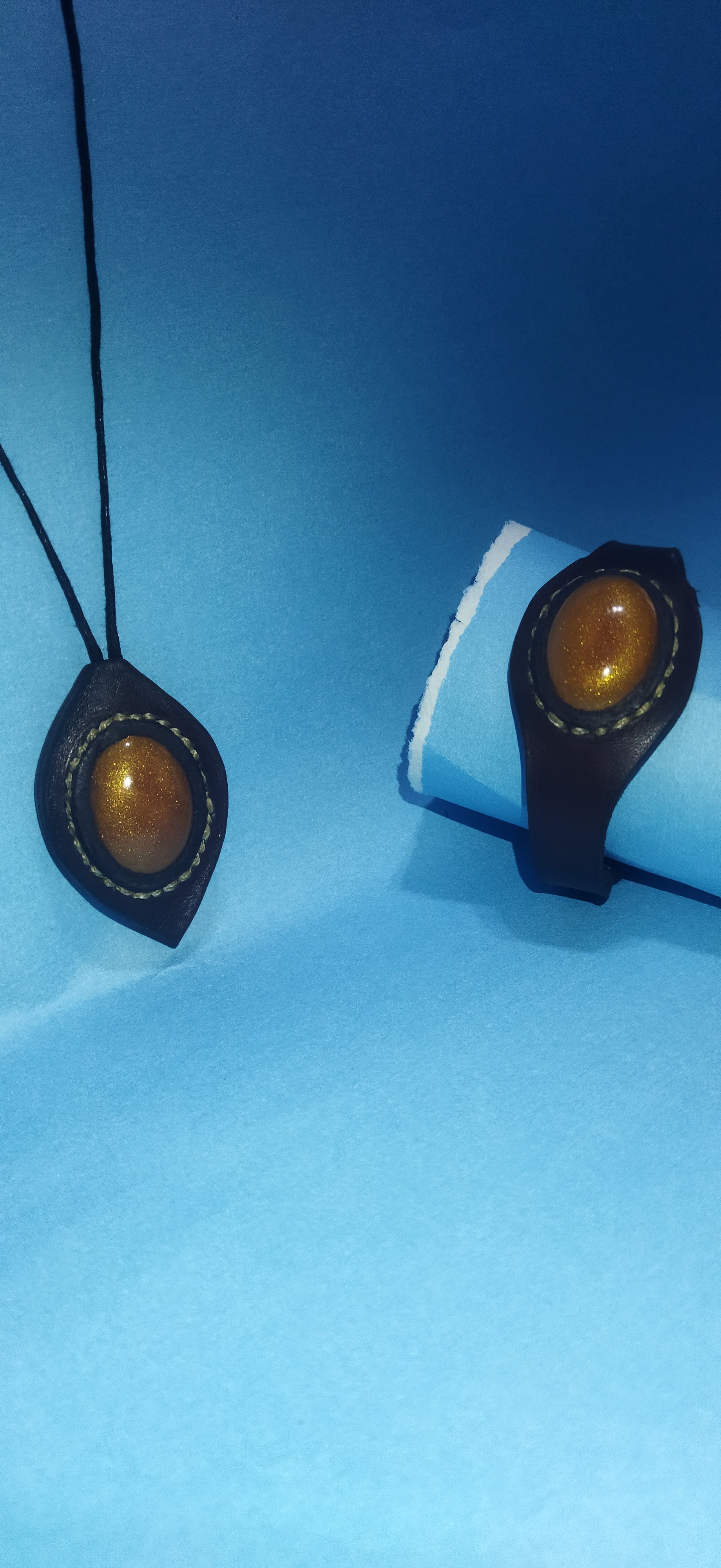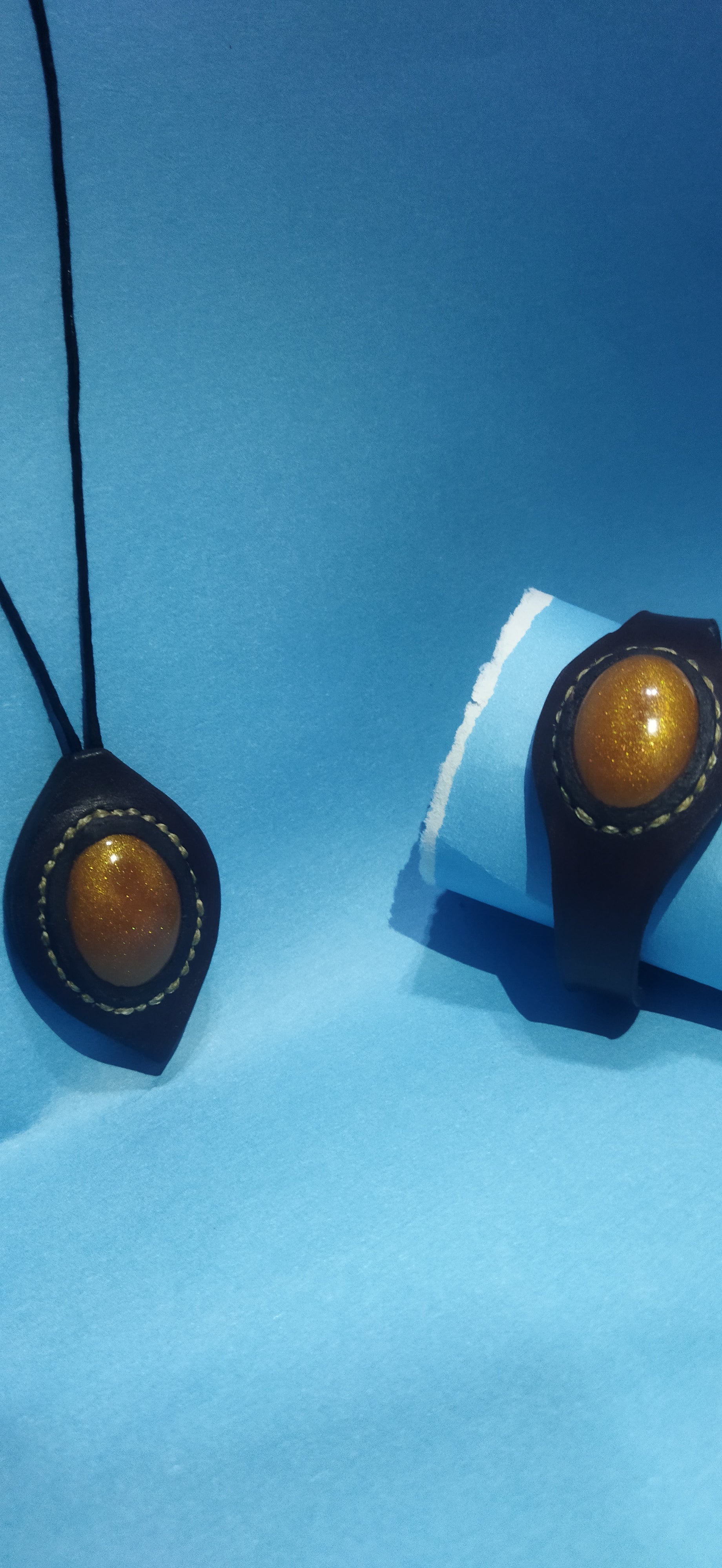 Epoksi ile beraber hakikileri birleştirilmiş kolye ve bileklik yapılmıştır