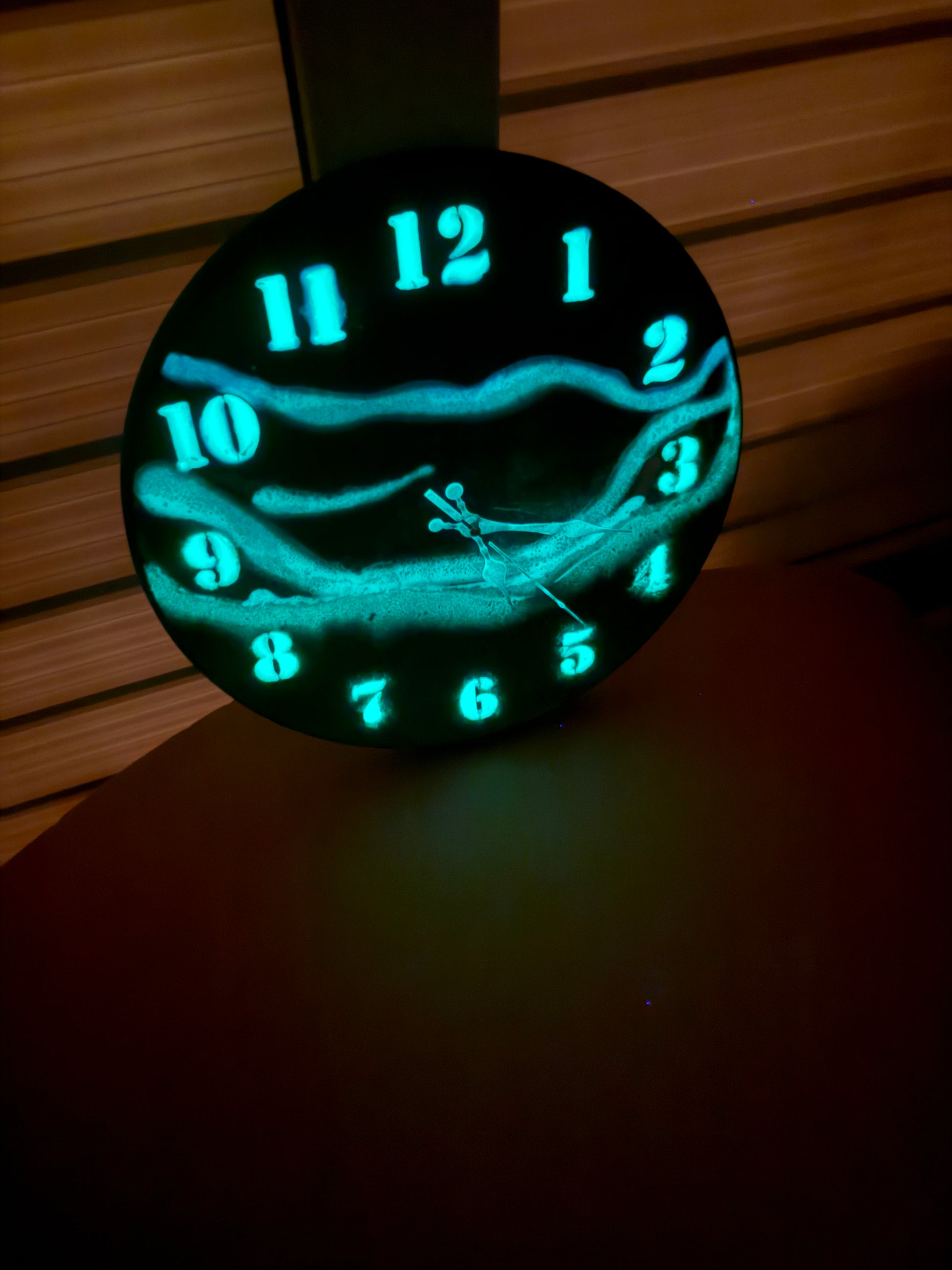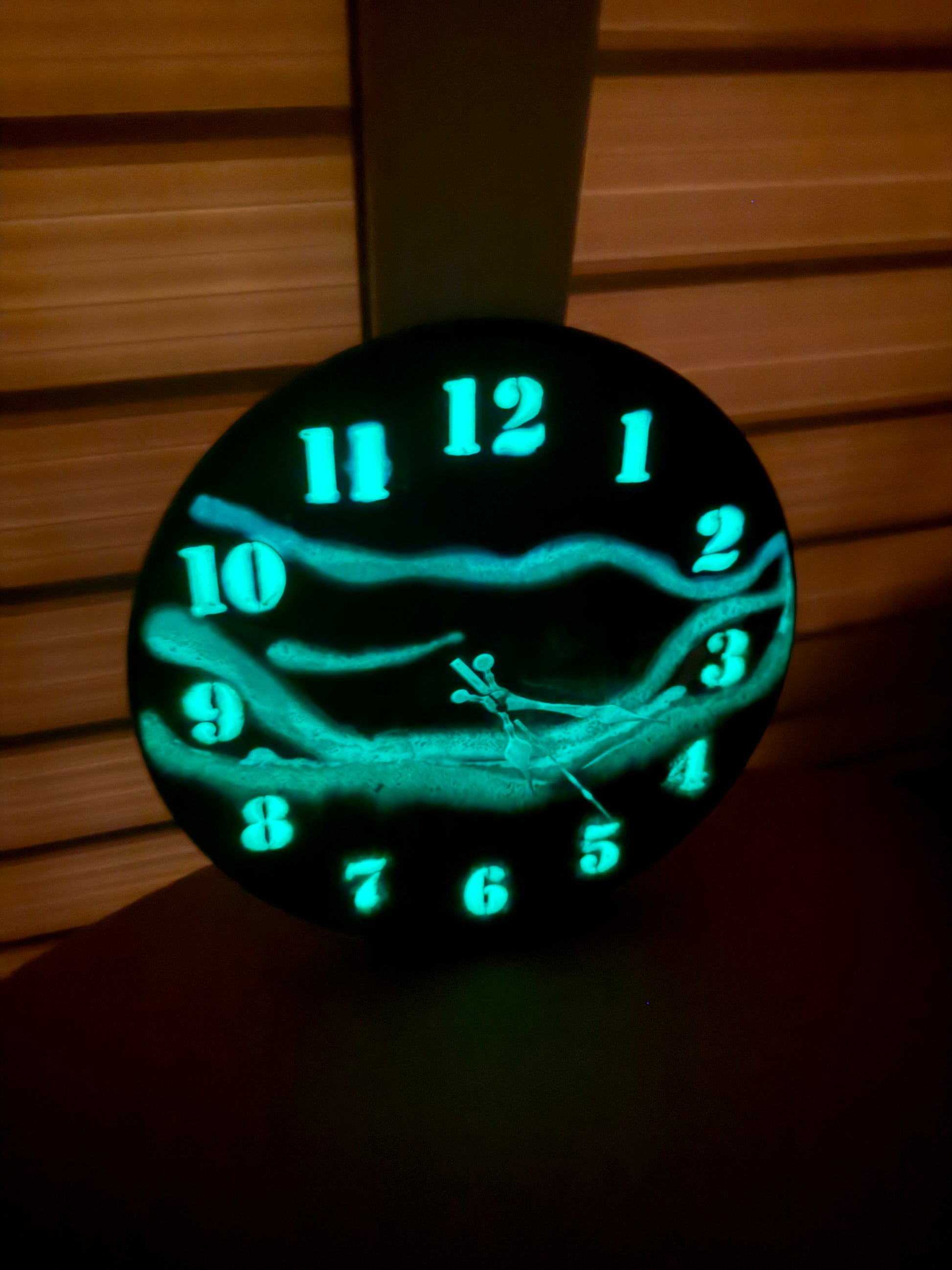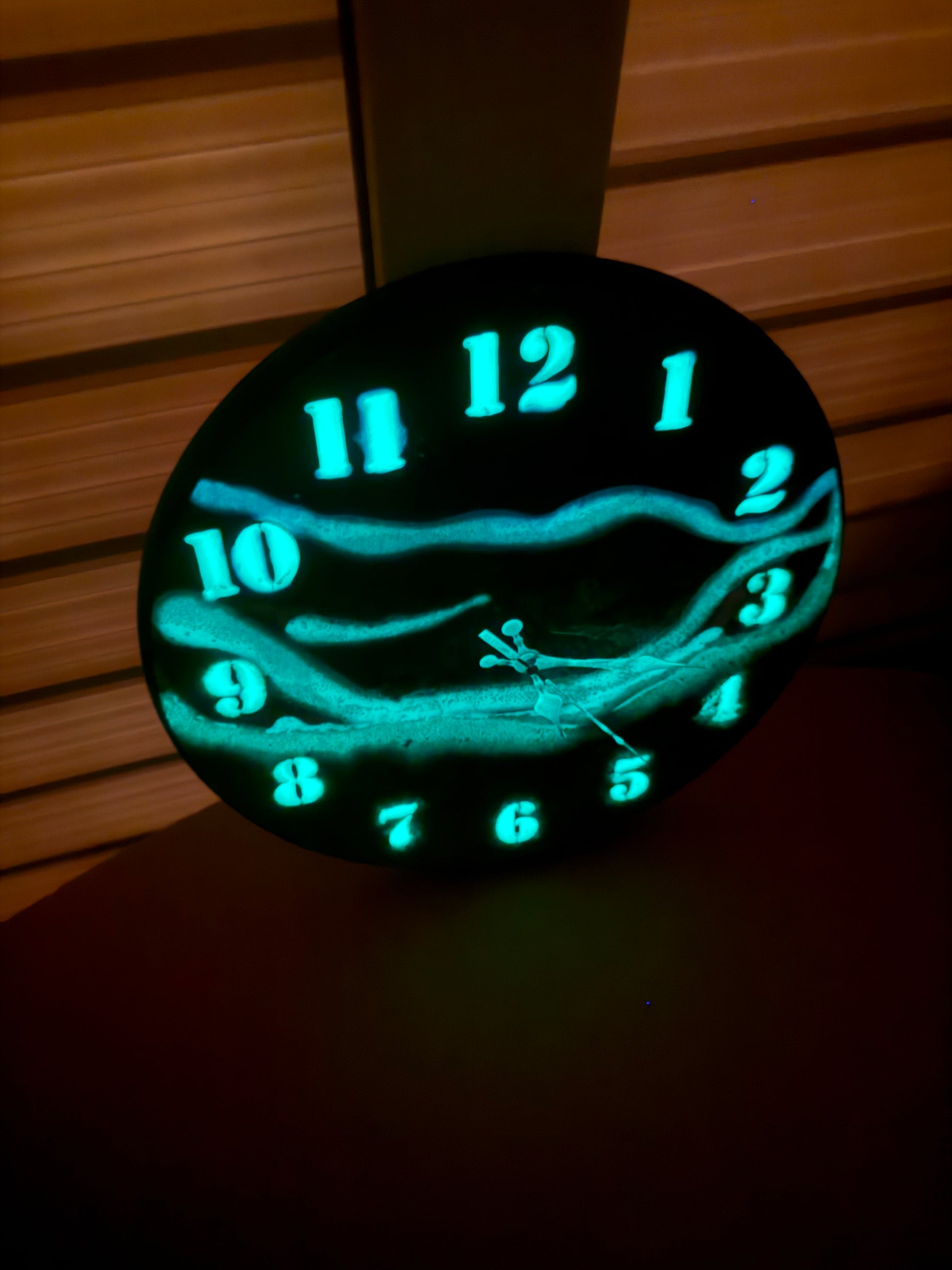 33 × 33 karanlıkta parlayan yeşil ve mavi tonlarda yapılmış rakamları ise yeşil olarak fosforlu kullanılmış akrep ve yelkovan’da da aynı boya kullanılmıştır mdf üzerine epoksi uygulanmıştır deniz efekti ile beraber şahane bir tasarım yapılmıştır