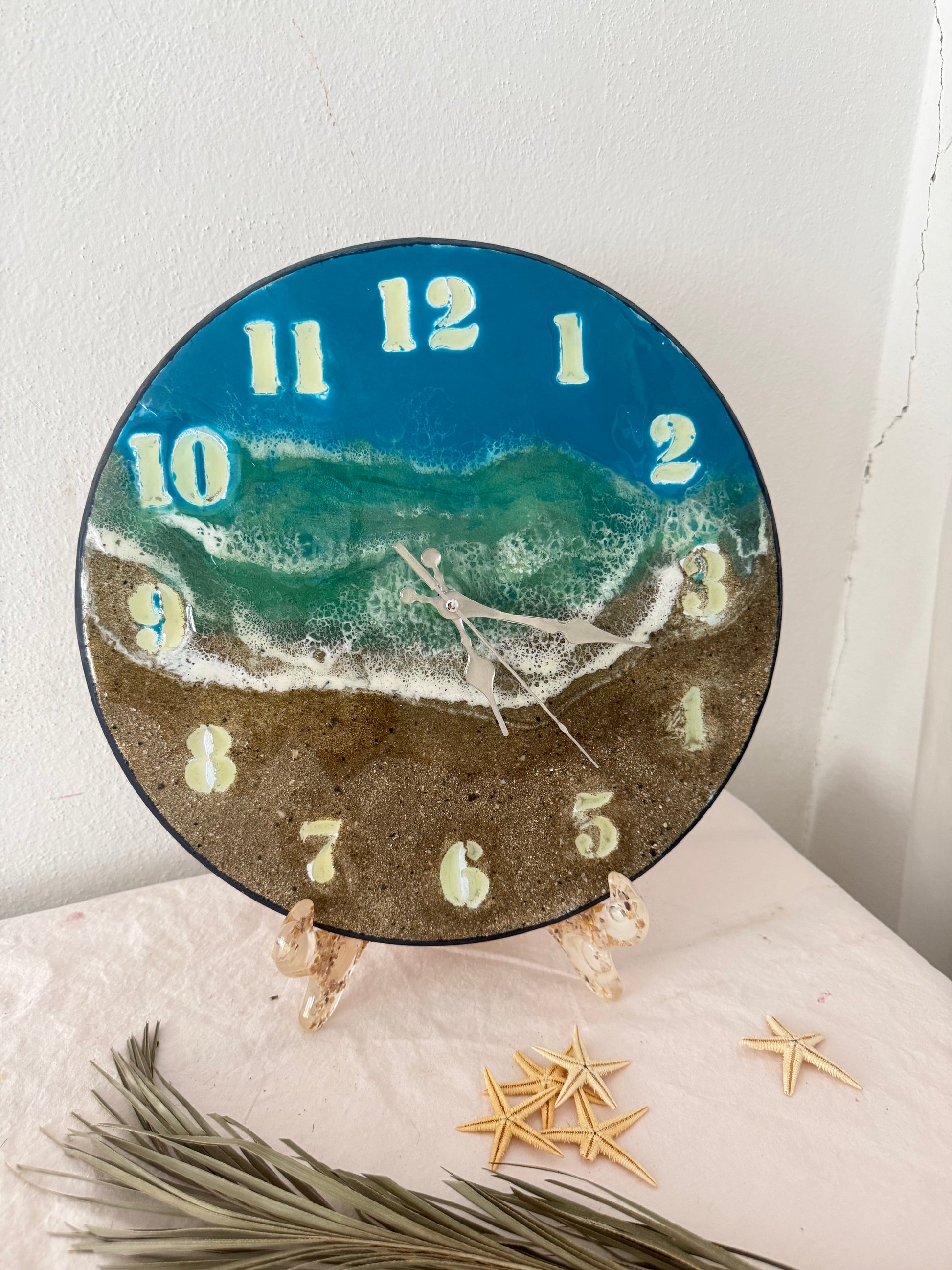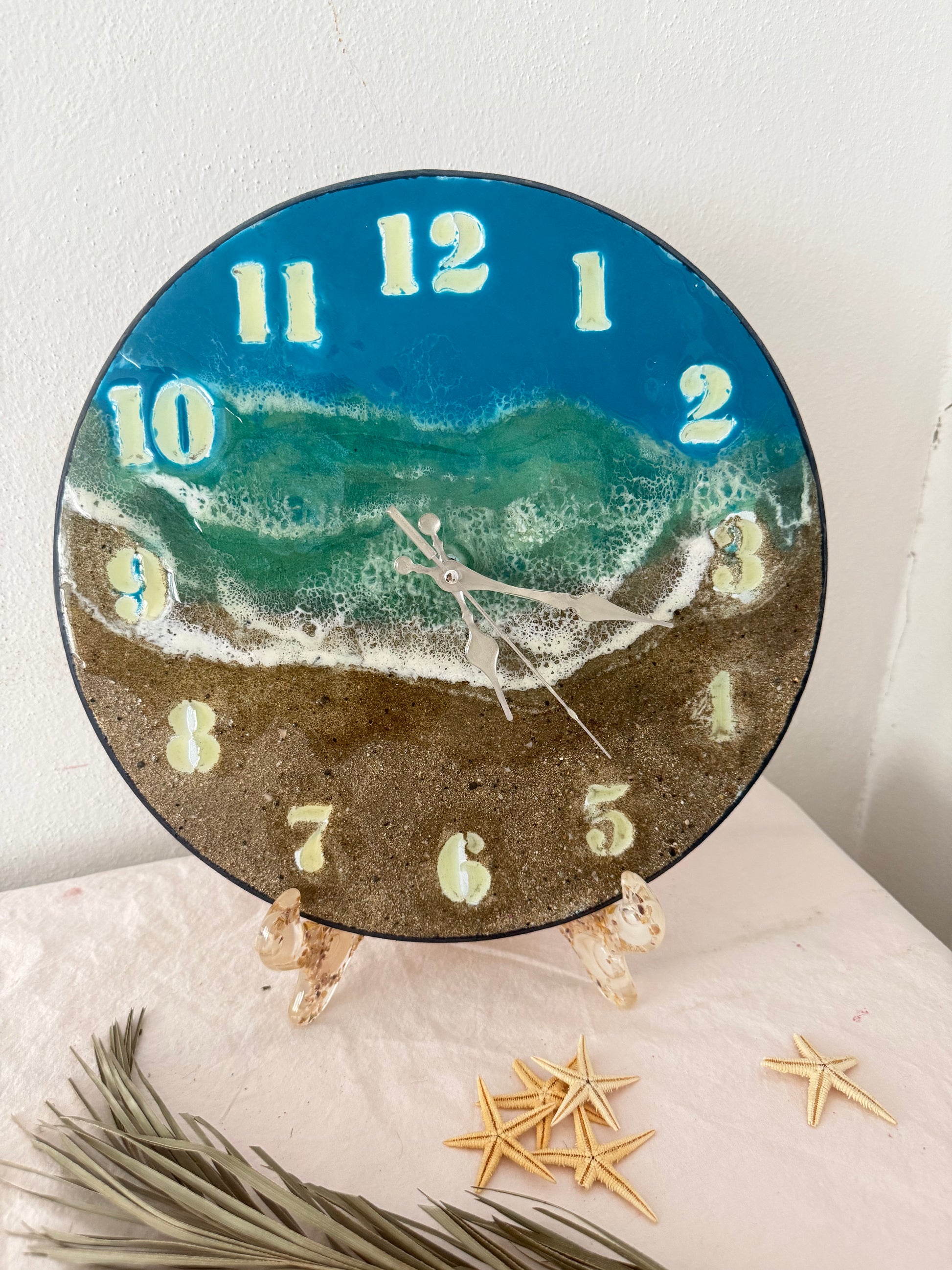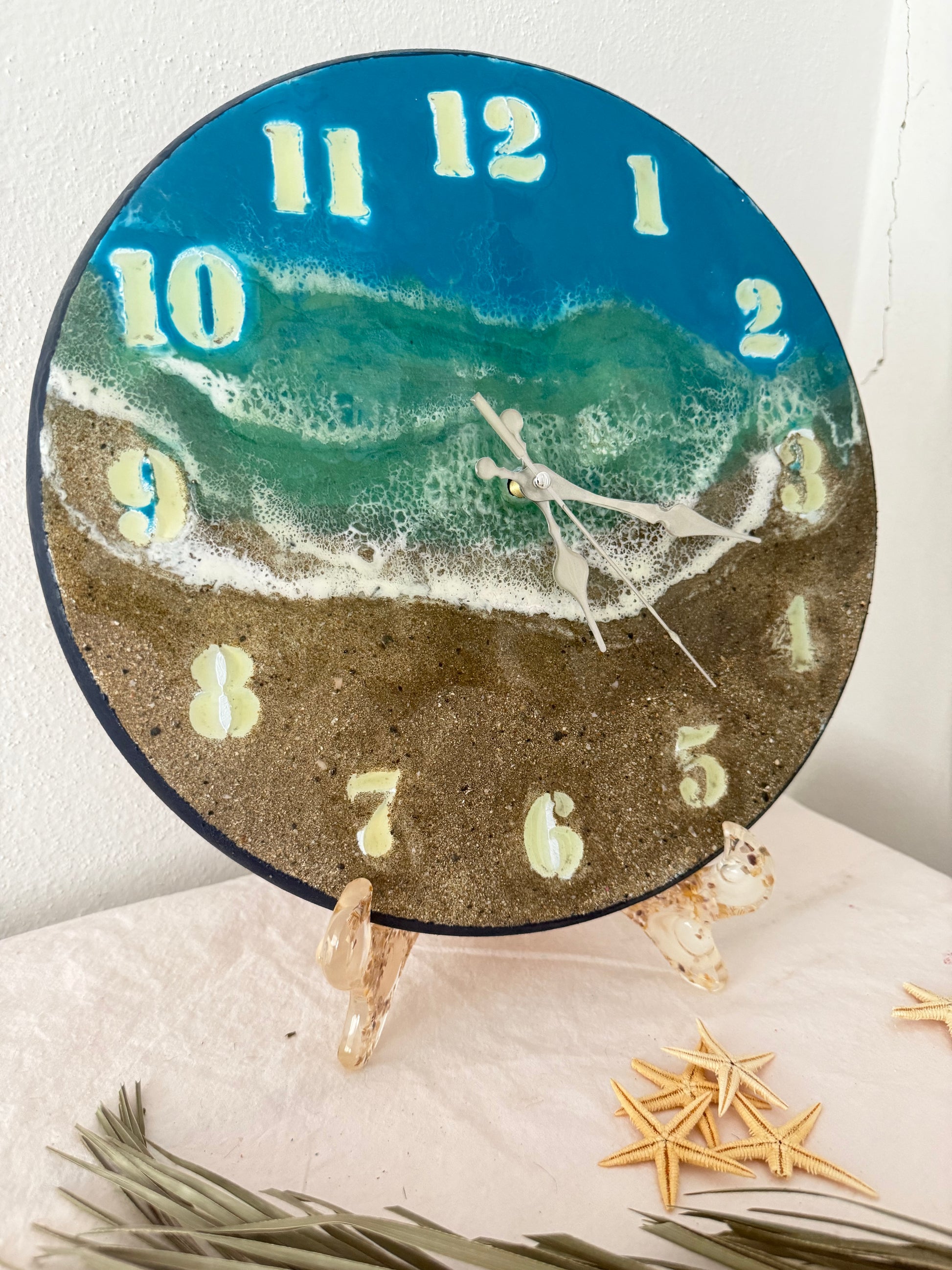 33 × 33 karanlıkta parlayan yeşil ve mavi tonlarda yapılmış rakamları ise yeşil olarak fosforlu kullanılmış akrep ve yelkovan’da da aynı boya kullanılmıştır mdf üzerine epoksi uygulanmıştır deniz efekti ile beraber şahane bir tasarım yapılmıştır