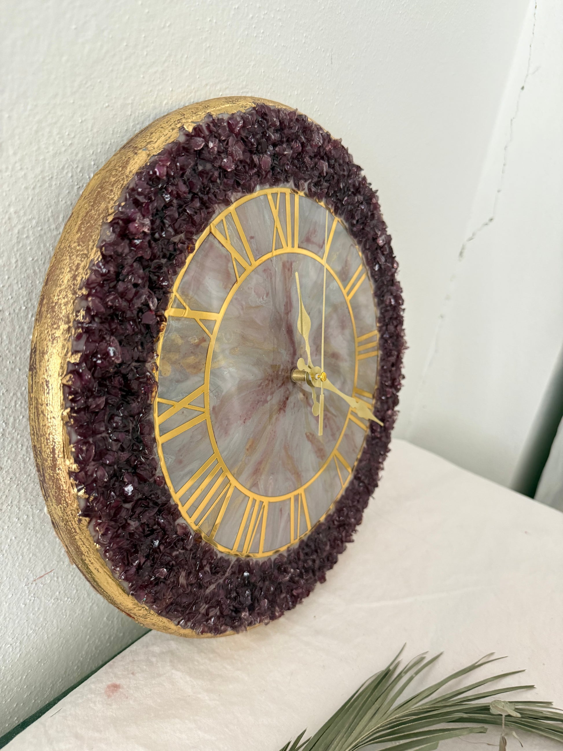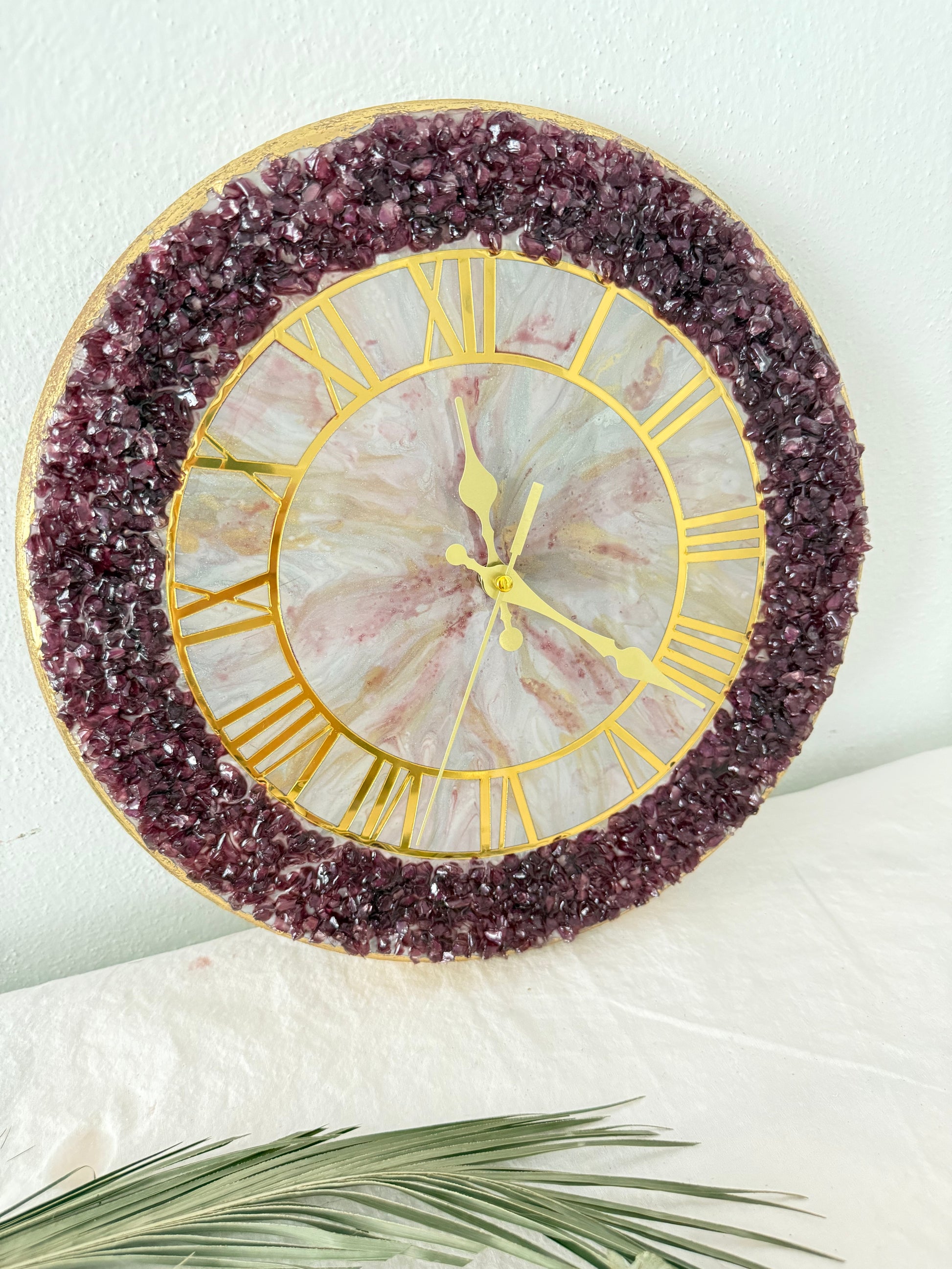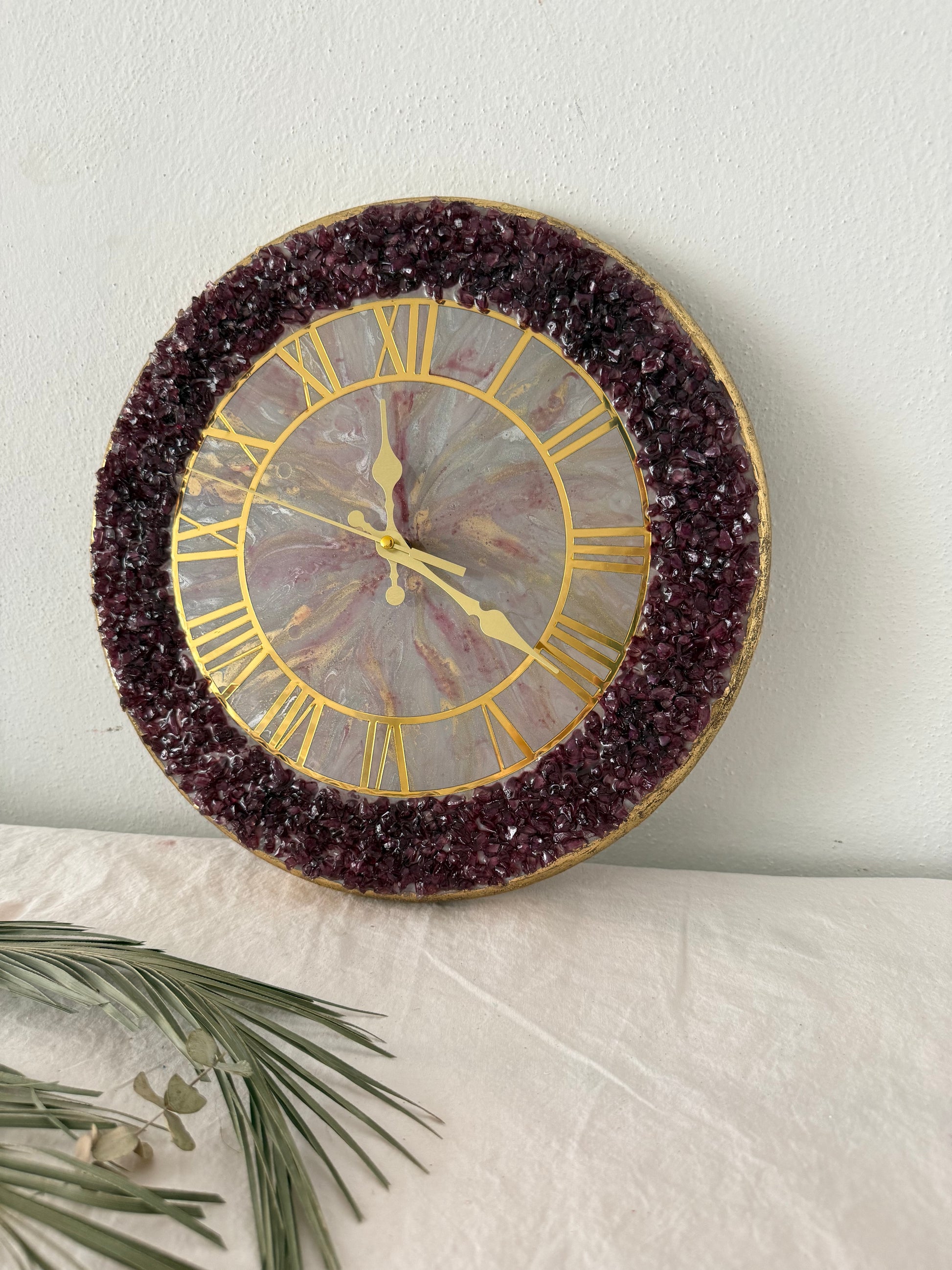 33’e 33 mor renkte cam kırıklarıyla oluşturulmuş epoksi ile çalışılmış mdf üzerine tasarlanmış duvar saati duvarlarınıza odanıza renk katacak ve sizlere özel düşündürecek epoksi duvar saati 1:00 adet olup tekrari yoktur onun için kaçırmayın