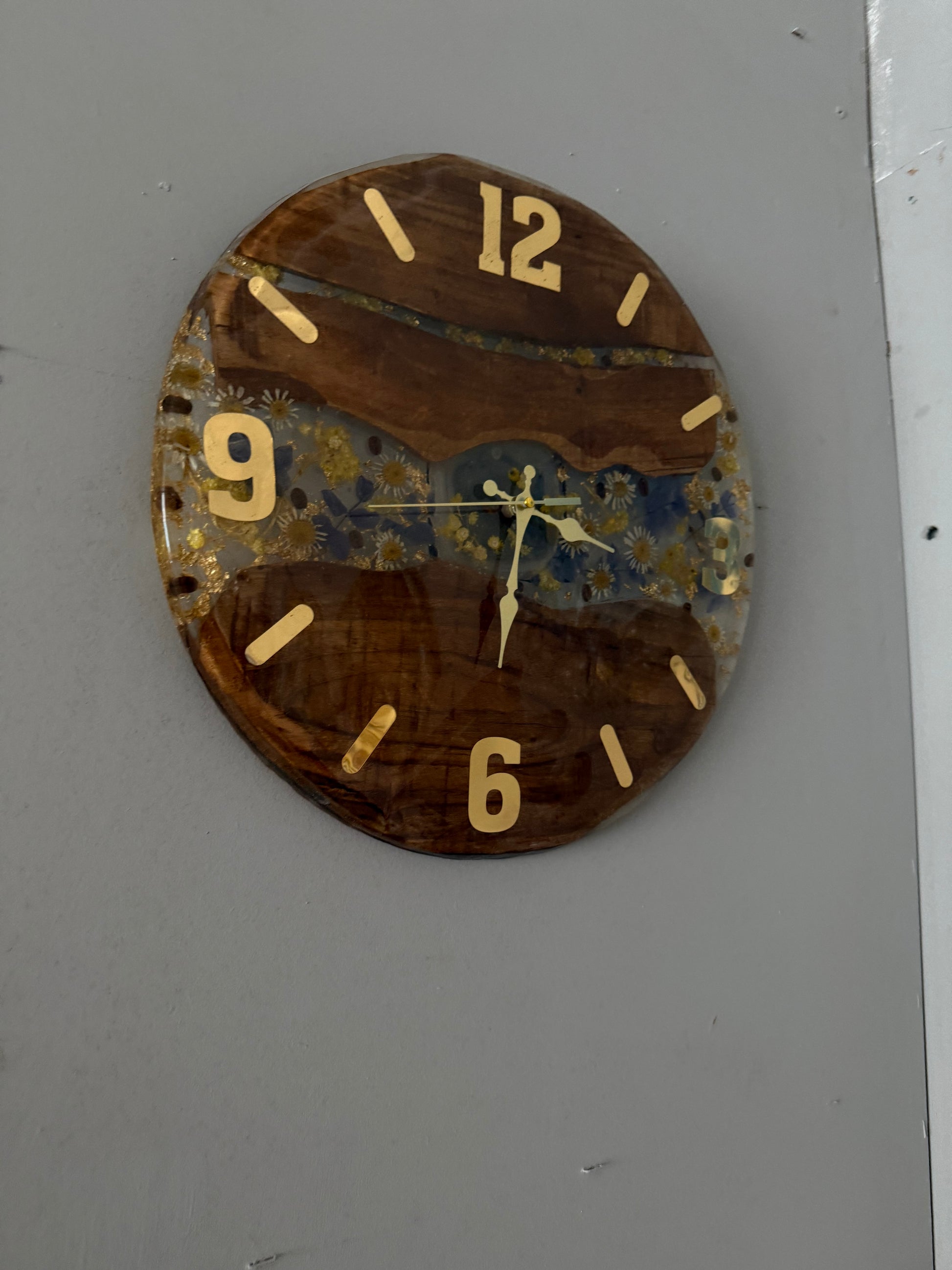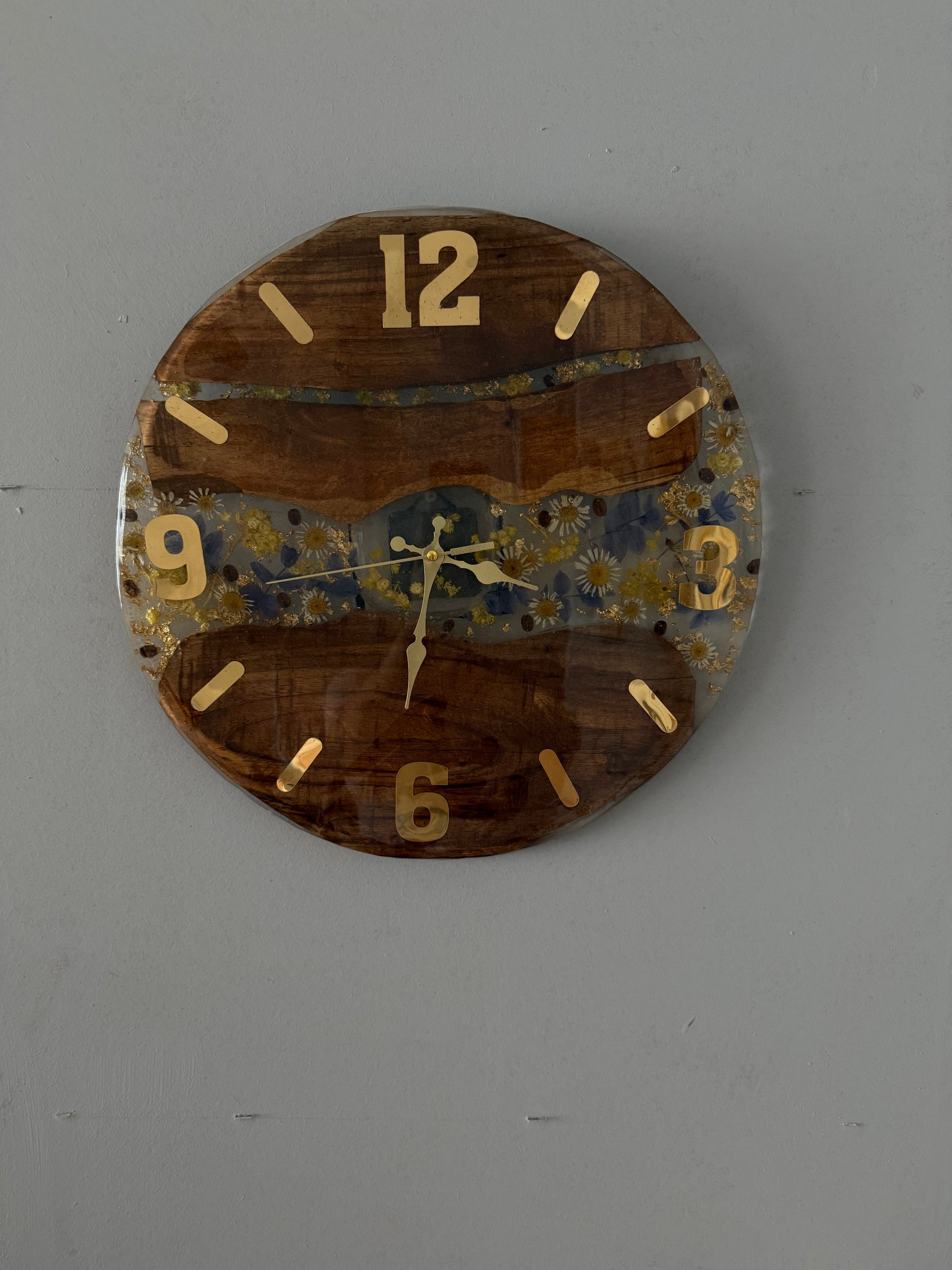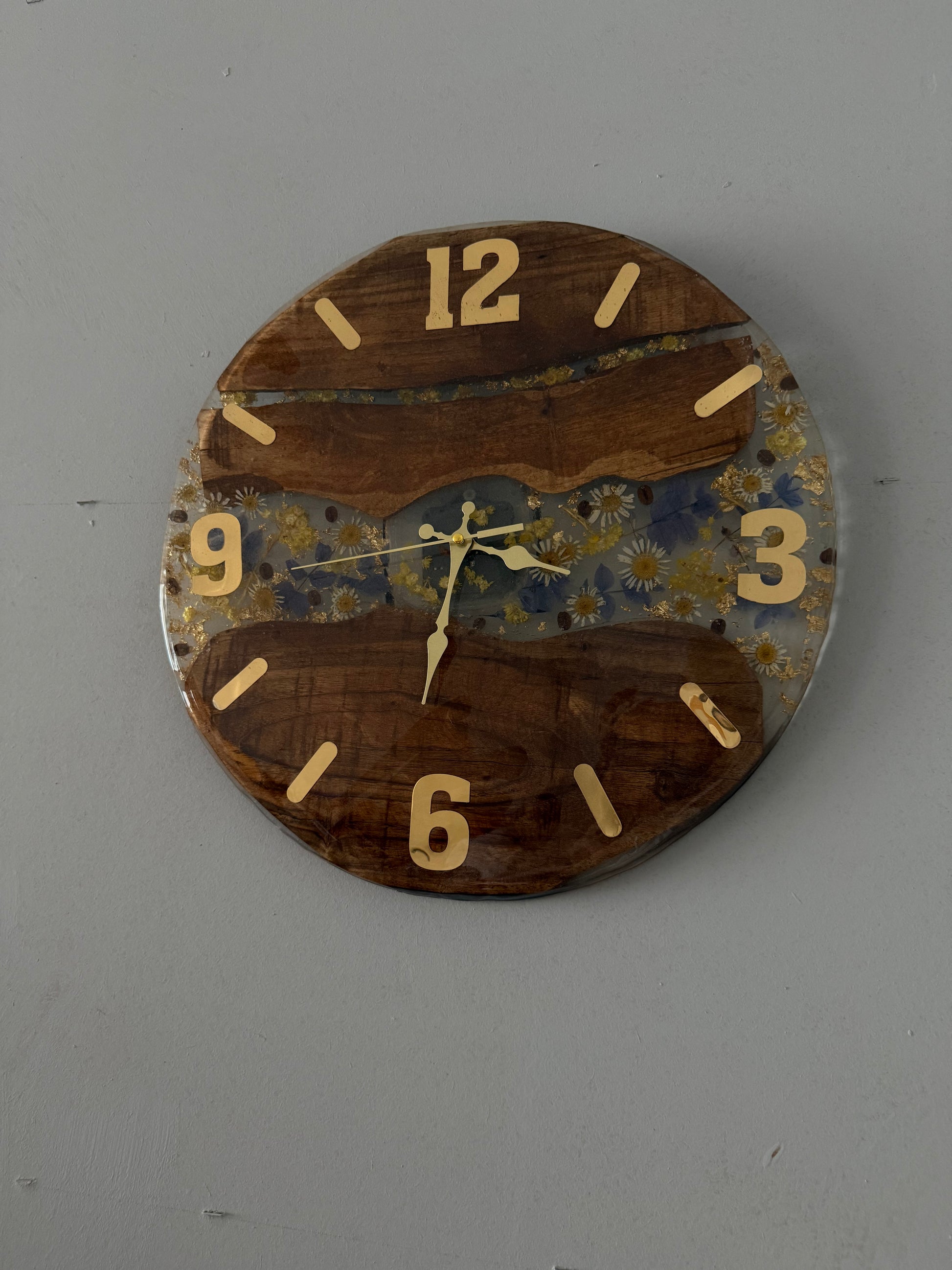 40 santime 40 santim 150 yıllık ceviz ağacı ile beraber papatyalar ve mor çiçekler birleştirilmiş kahve çekirdekleri ile beraber harmanlanmış tamamen epoksi ile beraber yapılmış bir duvar saati gold rakamlı gayet görünmesi kolay iri rakamlar kullanılmıştır
