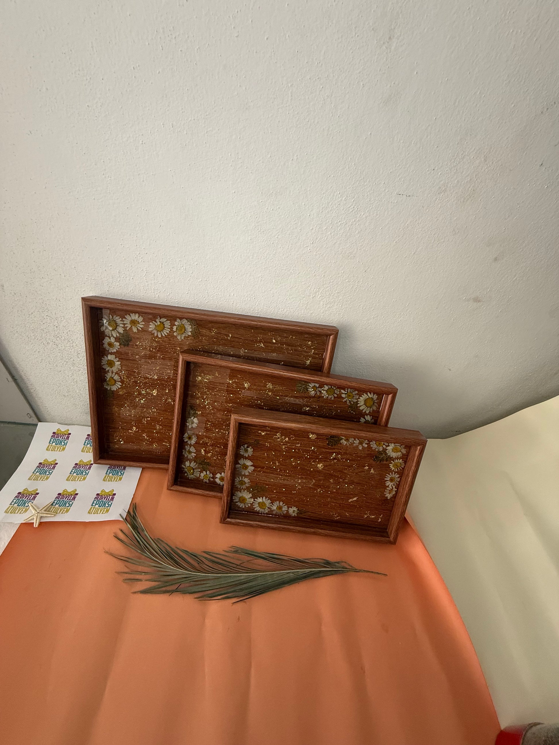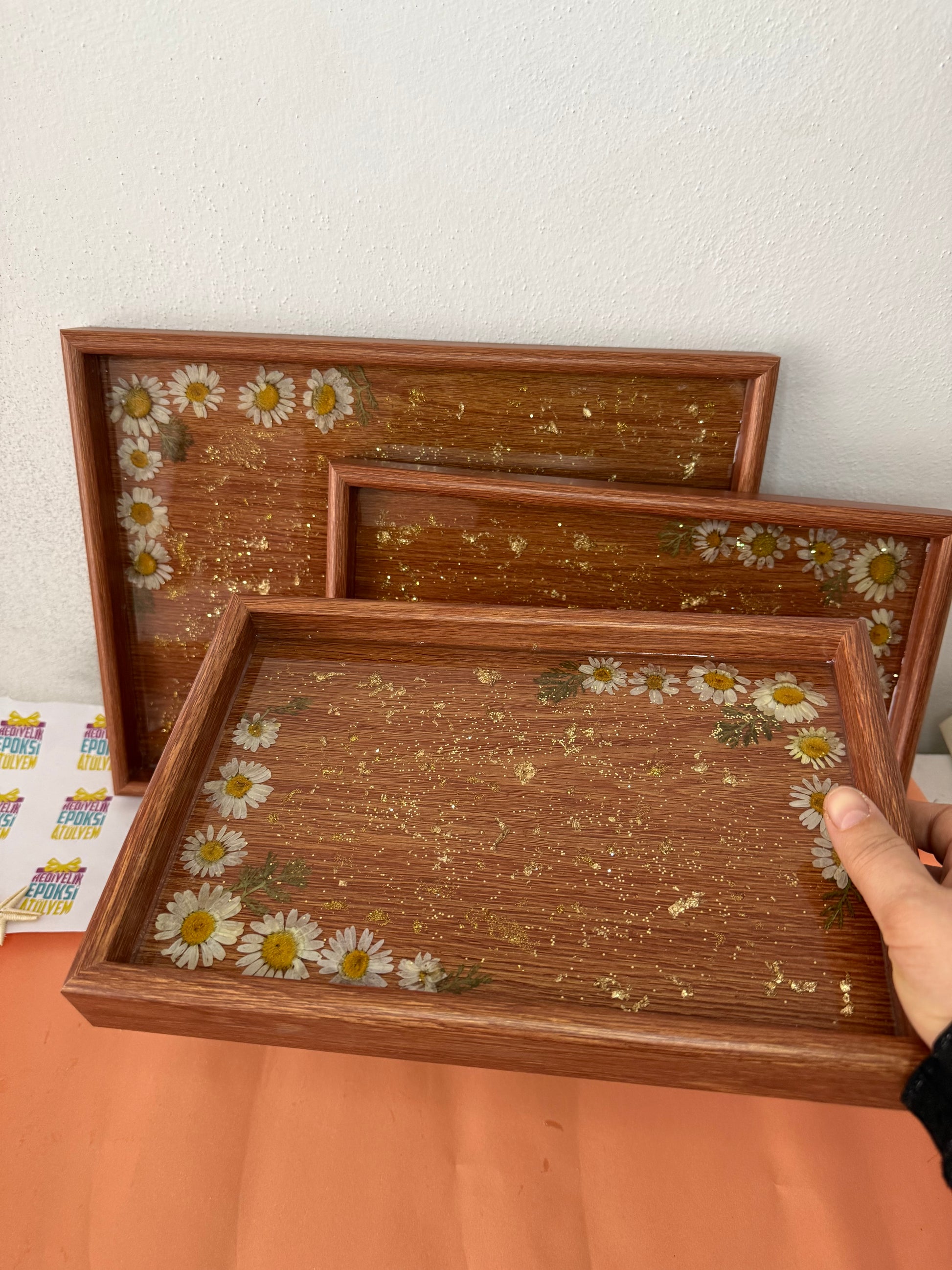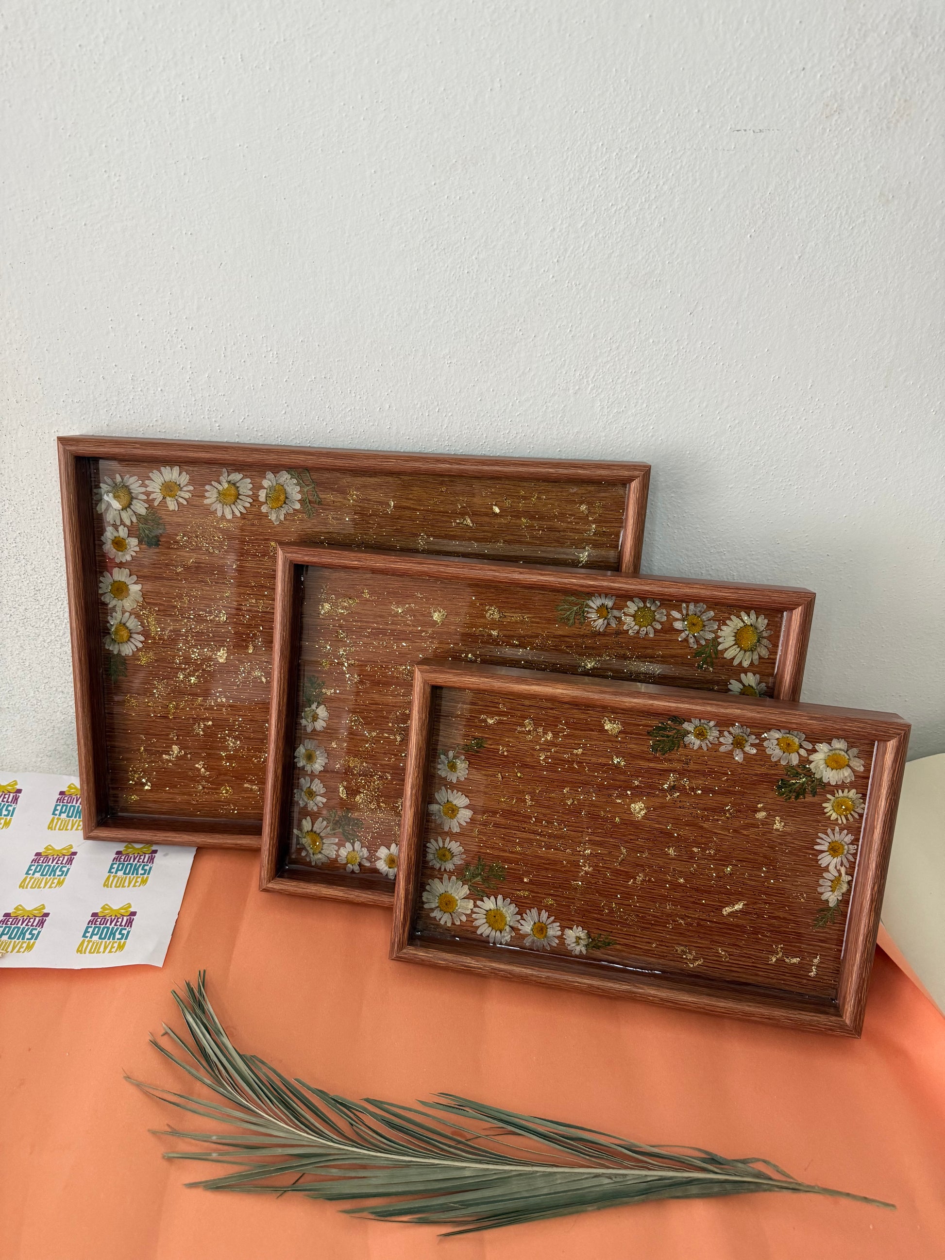Üçlü küçük boy orta boy büyük boy olmak üzere üçlü epoksi kaplama papatyalarla beraber birleştirilmiş epoksi tepsi
